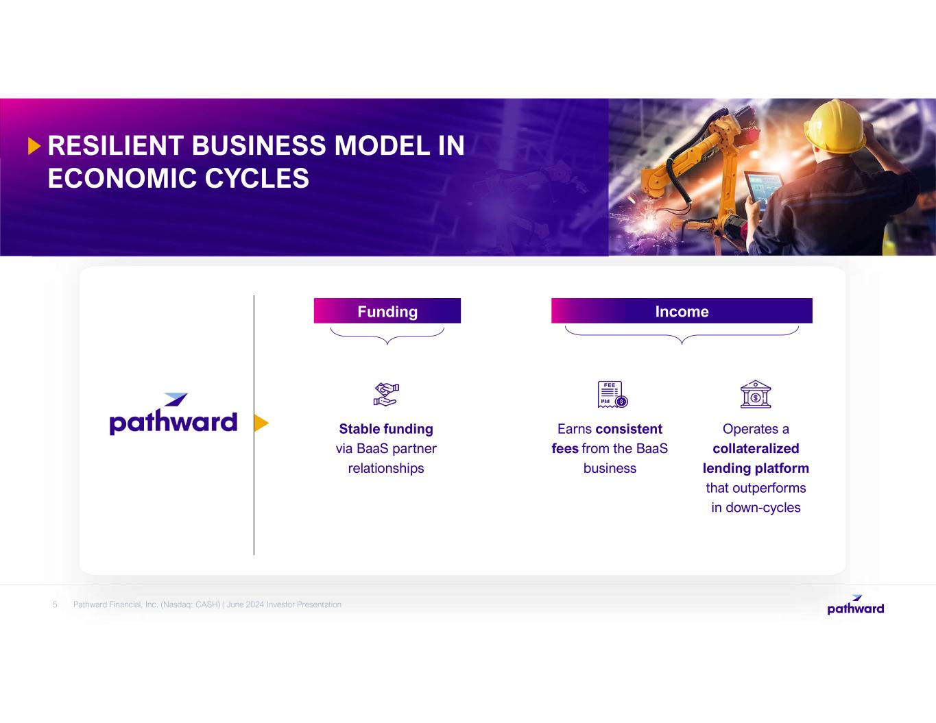 BUILDING A DIVERSIFIED COMPANY DEDICATED TO FINANCIAL EMPOWERMENT FOR INDIVIDUALS AND BUSINESSES 4 1993 Listed on Nasdaq: CASH 2015 / 2016 Entered Tax Services business by acquiring Refund Advantage, SCS, and EPS 2020 Completed sale of Retail Bank division to focus on national banking operations and BaaS Developed a governance structure that aligns with key ESG efforts Converted to National Bank Charter 2004 Created Prepaid Card Sponsorship business - now Banking as a Service (BaaS) 2014 Acquired AFS/IBEX, an insurance premium finance company 2018 Acquired Crestmark Bancorp, a commercial lending company Dramatic growth in deposits from Payments business heavily invested in securities, treasuries, and bond portfolio. 1954 Founded as a savings and loan bank 2021 Sold Meta trademarks and began rebranding initiative 2022 Completed rebranding as Pathward Financial 4 Pathward Financial, Inc. (Nasdaq: CASH) | June 2024 Investor Presentation