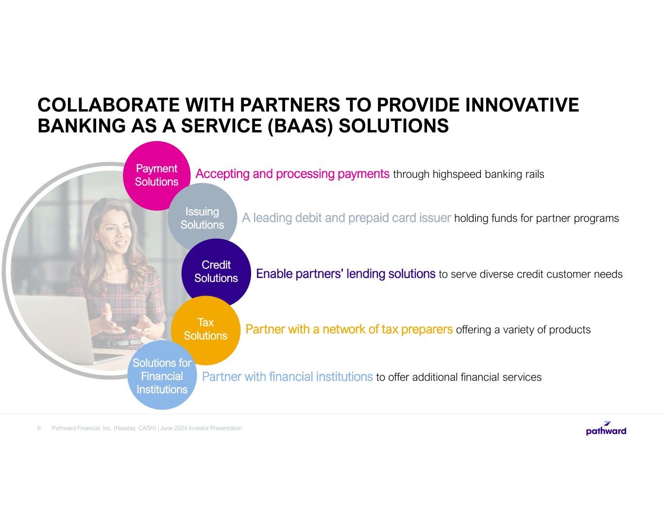 Stable funding via BaaS partner relationships Funding Earns consistent fees from the BaaS business Operates a collateralized lending platform that outperforms in down-cycles Income 5 RESILIENT BUSINESS MODEL IN ECONOMIC CYCLES Pathward Financial, Inc. (Nasdaq: CASH) | June 2024 Investor Presentation