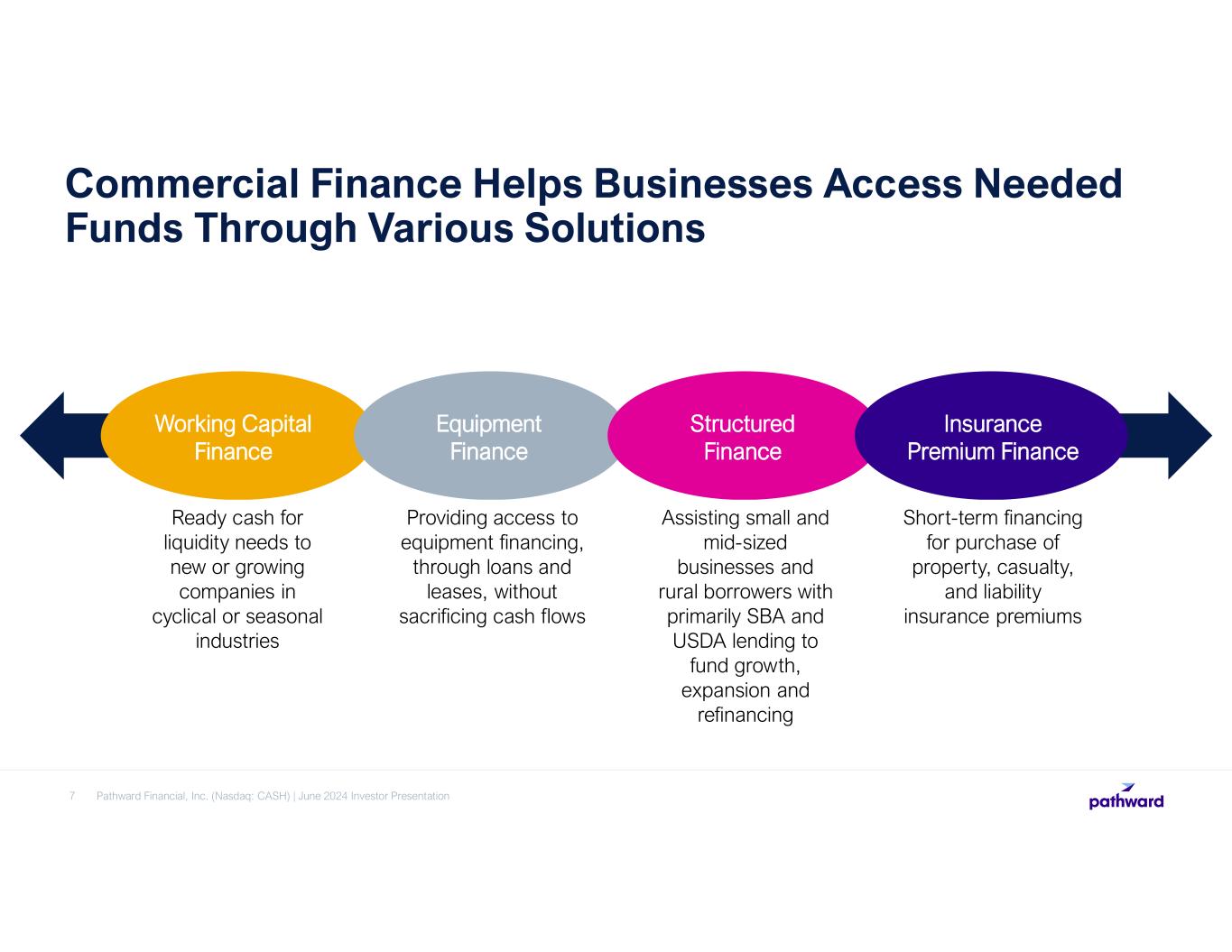 COLLABORATE WITH PARTNERS TO PROVIDE INNOVATIVE BANKING AS A SERVICE (BAAS) SOLUTIONS 6 Payment Solutions Issuing Solutions Credit Solutions Tax Solutions Solutions for Financial Institutions Accepting and processing payments through highspeed banking rails A leading debit and prepaid card issuer holding funds for partner programs Enable partners’ lending solutions to serve diverse credit customer needs Partner with a network of tax preparers offering a variety of products Partner with financial institutions to offer additional financial services Pathward Financial, Inc. (Nasdaq: CASH) | June 2024 Investor Presentation