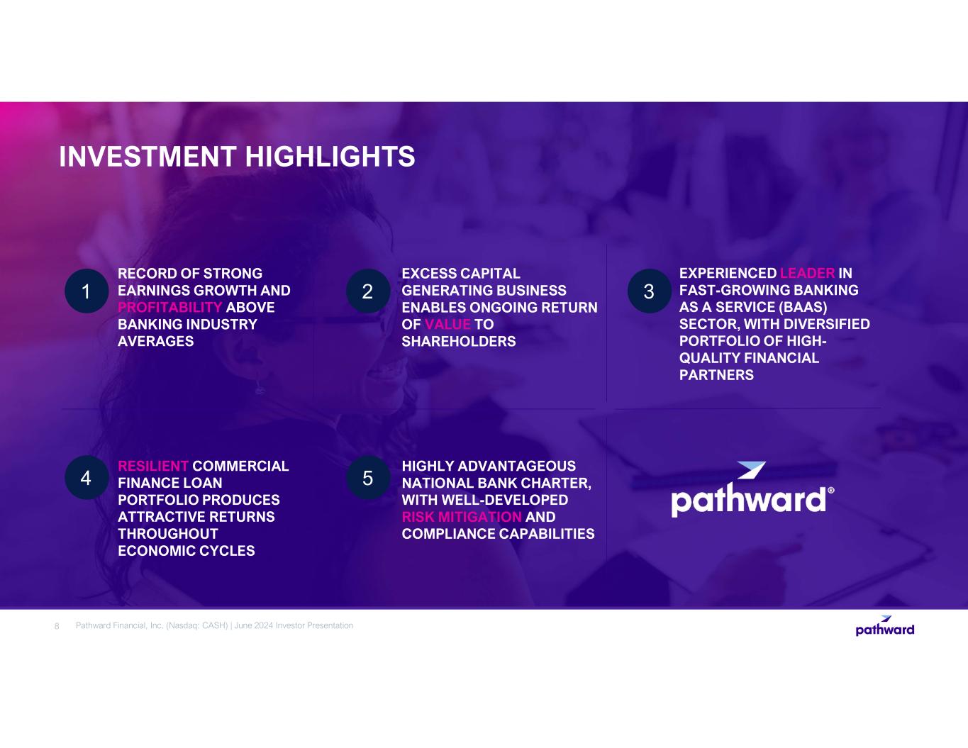 7 Commercial Finance Helps Businesses Access Needed Funds Through Various Solutions Working Capital Finance Equipment Finance Structured Finance Insurance Premium Finance Ready cash for liquidity needs to new or growing companies in cyclical or seasonal industries Providing access to equipment financing, through loans and leases, without sacrificing cash flows Assisting small and mid-sized businesses and rural borrowers with primarily SBA and USDA lending to fund growth, expansion and refinancing Short-term financing for purchase of property, casualty, and liability insurance premiums Pathward Financial, Inc. (Nasdaq: CASH) | June 2024 Investor Presentation