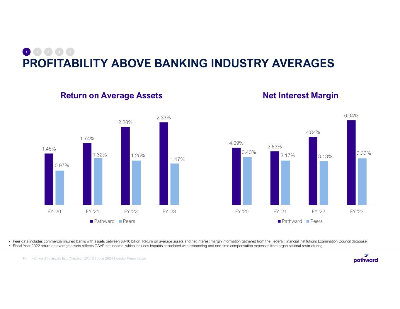RECORD OF STRONG EARNINGS GROWTH 9 1 2 3 4 5 Earnings Per Common Share Earnings inclusive of extraordinary items In fiscal year 2022, the company sold its Meta names and trademarks and completed a Company rebrand. Adjustments to earnings in fiscal year 2022 include the revenue from the sale, expenses associated with rebranding, and additional one- time compensation expenses stemming from organizational restructuring. Fiscal year 2023 displays GAAP earnings as the net adjustments for the period are insignificant. See appendix for non-GAAP reconciliation. Net Income $ in millions $1.67 $2.49 $2.94 $4.38 $4.49 $5.99 FY ’18 FY ’19 FY ’20 FY ’21 FY ’22 FY ’23 $5.26+29% $51.6 $97.0 $104.7 $141.7 $131.4 $163.6 FY ’18 FY ’19 FY ’20 FY ’21 FY ’22 FY ’23 $156.4 +26%CAGR CAGR Pathward Financial, Inc. (Nasdaq: CASH) | June 2024 Investor Presentation