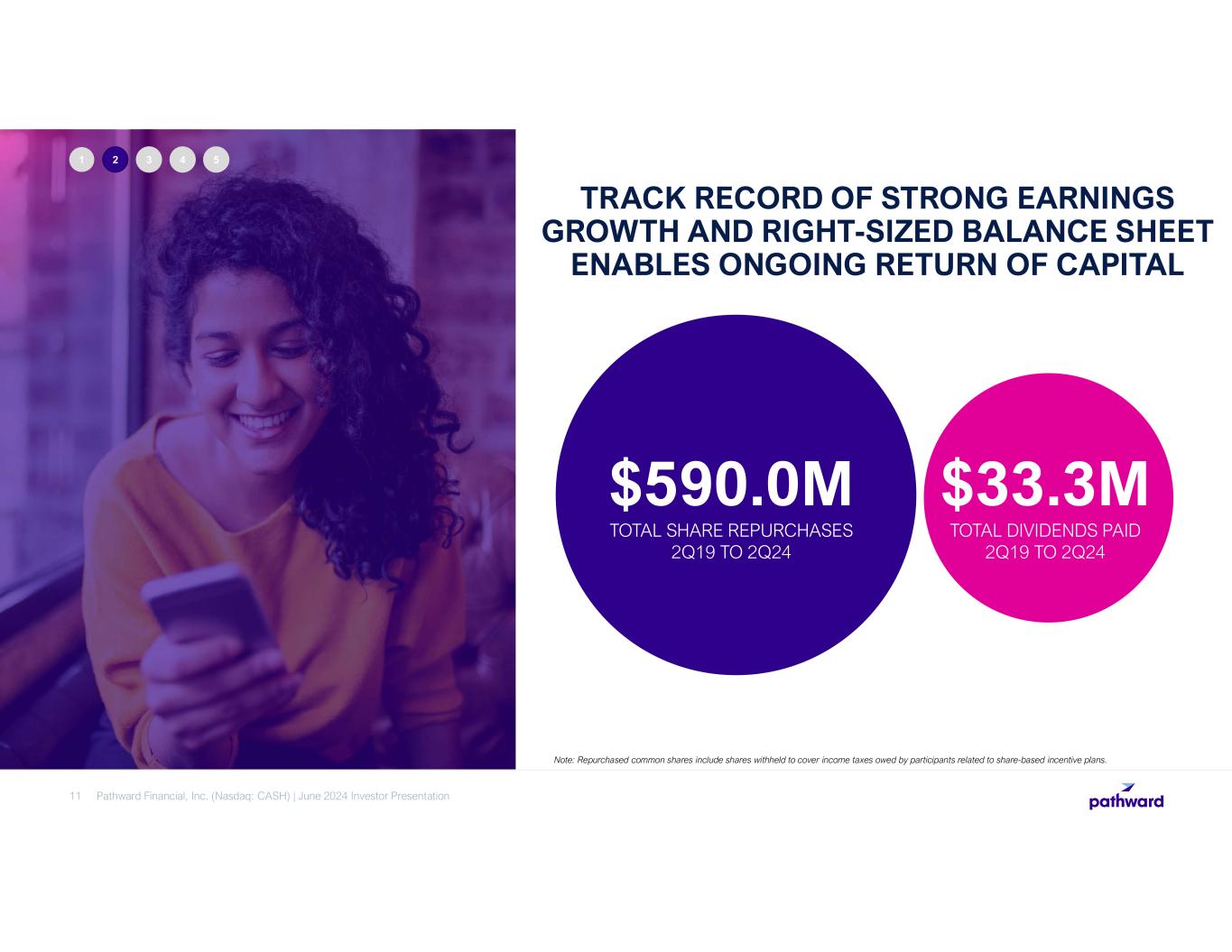 TRACK RECORD OF STRONG EARNINGS GROWTH AND RIGHT-SIZED BALANCE SHEET ENABLES ONGOING RETURN OF CAPITAL 11 1 2 3 4 5 $590.0M TOTAL SHARE REPURCHASES 2Q19 TO 2Q24 $33.3M TOTAL DIVIDENDS PAID 2Q19 TO 2Q24 Note: Repurchased common shares include shares withheld to cover income taxes owed by participants related to share-based incentive plans. Pathward Financial, Inc. (Nasdaq: CASH) | June 2024 Investor Presentation