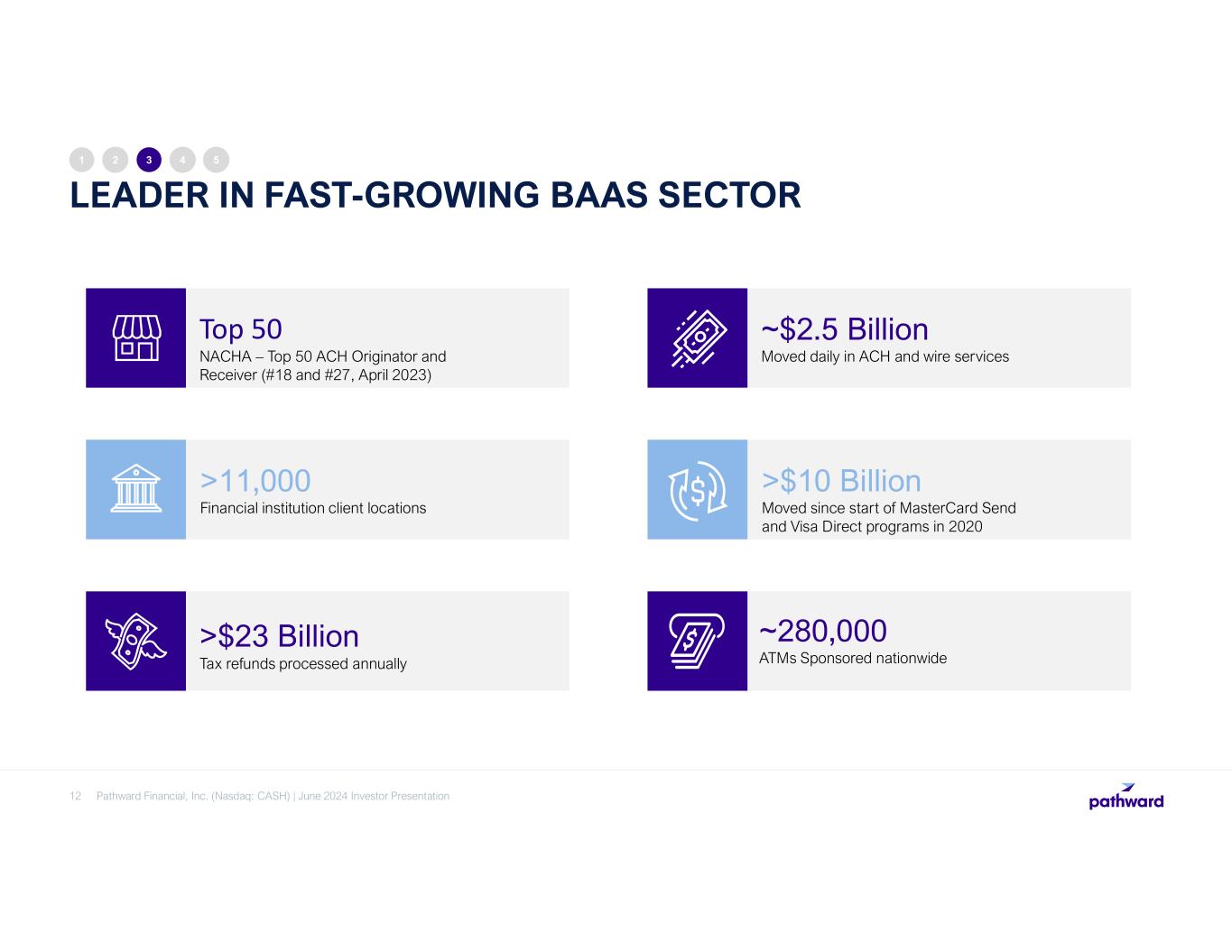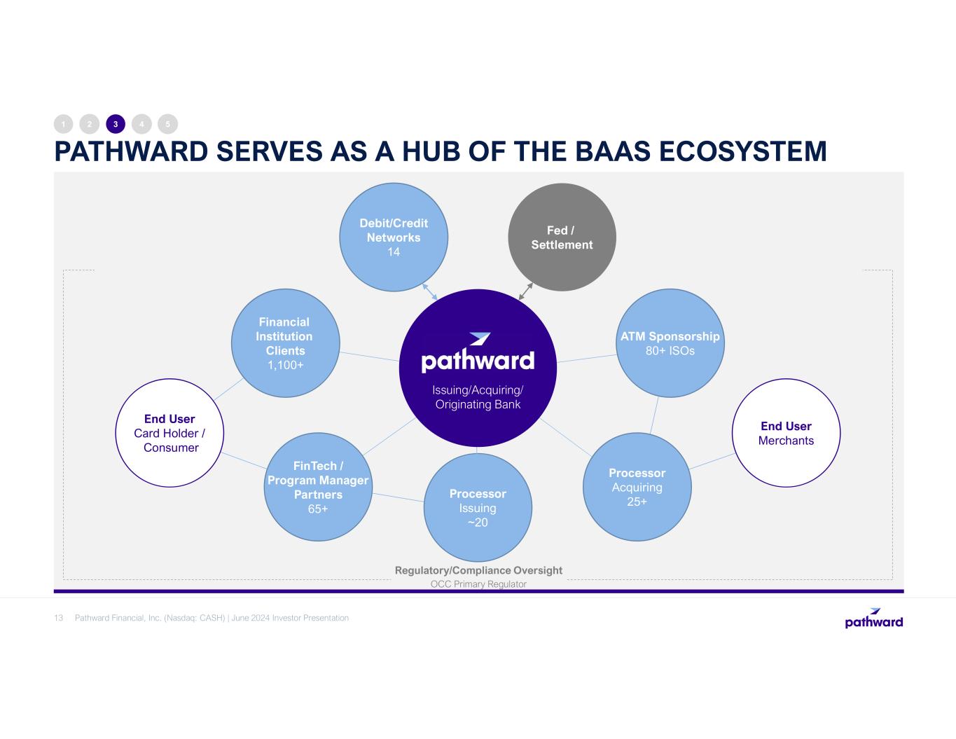 LEADER IN FAST-GROWING BAAS SECTOR 12 1 2 3 4 5 ~$2.5 Billion Moved daily in ACH and wire services >$10 Billion Moved since start of MasterCard Send and Visa Direct programs in 2020 ~280,000 ATMs Sponsored nationwide Top 50 NACHA – Top 50 ACH Originator and Receiver (#18 and #27, April 2023) >11,000 Financial institution client locations >$23 Billion Tax refunds processed annually Pathward Financial, Inc. (Nasdaq: CASH) | June 2024 Investor Presentation