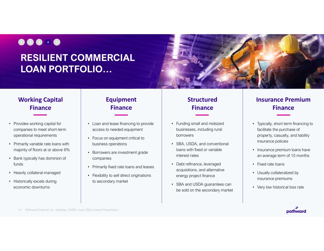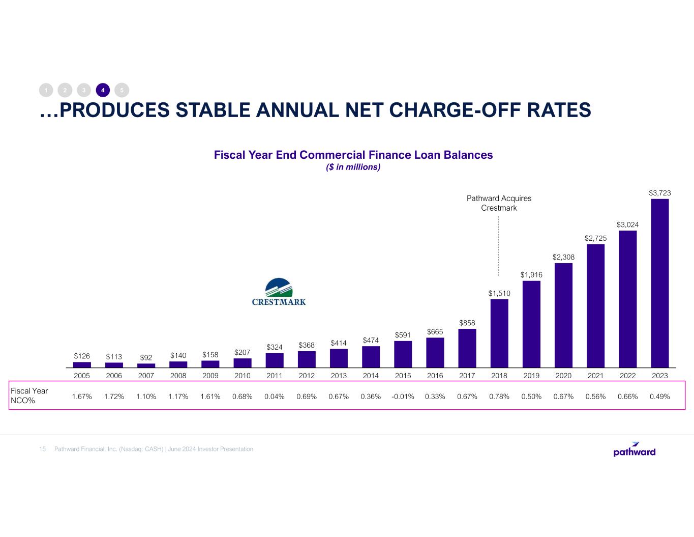 Working Capital Finance • Provides working capital for companies to meet short-term operational requirements • Primarily variable rate loans with majority of floors at or above 6% • Bank typically has dominion of funds • Heavily collateral-managed • Historically excels during economic downturns Equipment Finance • Loan and lease financing to provide access to needed equipment • Focus on equipment critical to business operations • Borrowers are investment grade companies • Primarily fixed rate loans and leases • Flexibility to sell direct originations to secondary market Structured Finance • Funding small and midsized businesses, including rural borrowers • SBA, USDA, and conventional loans with fixed or variable interest rates • Debt refinance, leveraged acquisitions, and alternative energy project finance • SBA and USDA guarantees can be sold on the secondary market Insurance Premium Finance • Typically, short-term financing to facilitate the purchase of property, casualty, and liability insurance policies • Insurance premium loans have an average term of 10 months • Fixed rate loans • Usually collateralized by insurance premiums • Very low historical loss rate RESILIENT COMMERCIAL LOAN PORTFOLIO… 14 1 2 3 4 5 Pathward Financial, Inc. (Nasdaq: CASH) | June 2024 Investor Presentation