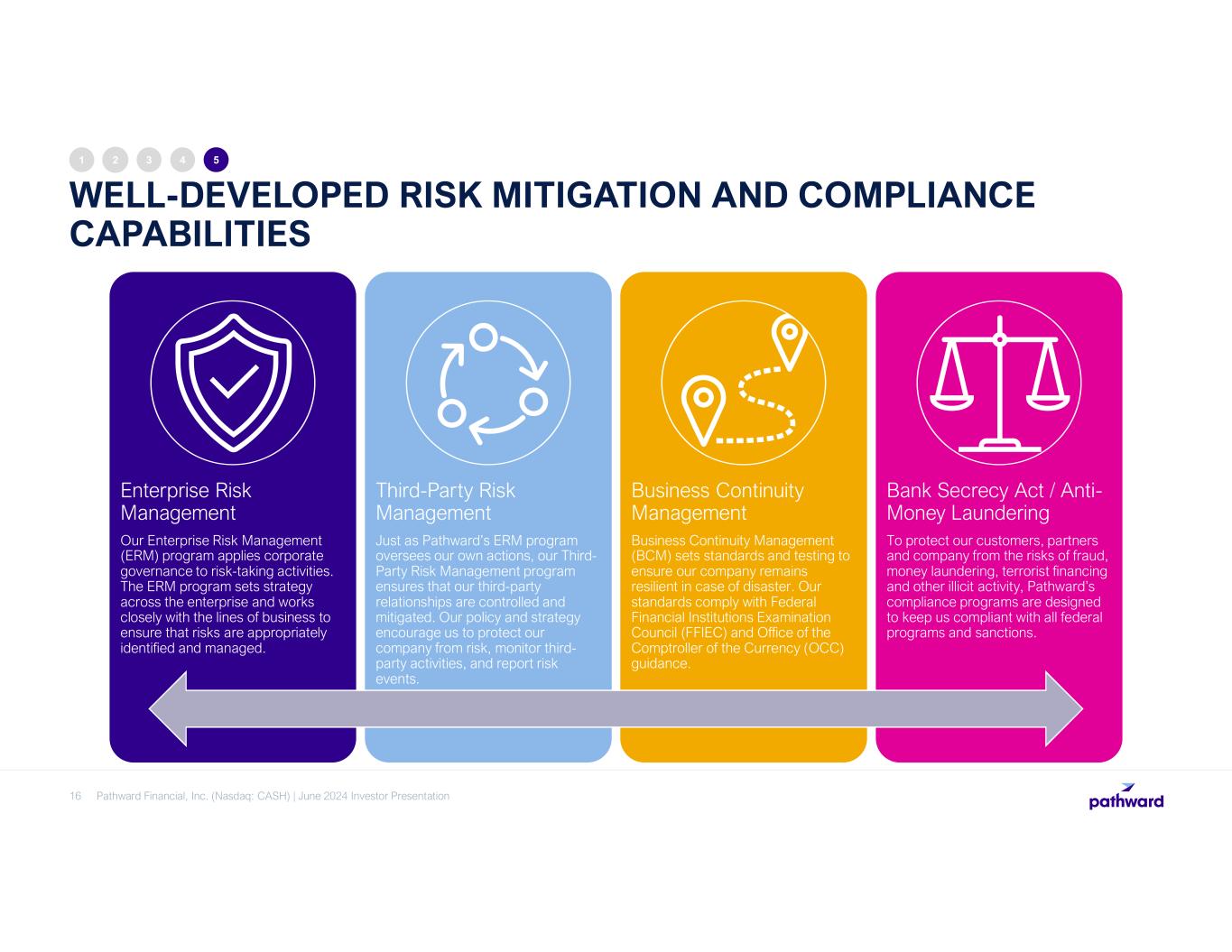 WELL-DEVELOPED RISK MITIGATION AND COMPLIANCE CAPABILITIES 16 1 2 3 4 5 Enterprise Risk Management Our Enterprise Risk Management (ERM) program applies corporate governance to risk-taking activities. The ERM program sets strategy across the enterprise and works closely with the lines of business to ensure that risks are appropriately identified and managed. Third-Party Risk Management Just as Pathward’s ERM program oversees our own actions, our Third- Party Risk Management program ensures that our third-party relationships are controlled and mitigated. Our policy and strategy encourage us to protect our company from risk, monitor third- party activities, and report risk events. Business Continuity Management Business Continuity Management (BCM) sets standards and testing to ensure our company remains resilient in case of disaster. Our standards comply with Federal Financial Institutions Examination Council (FFIEC) and Office of the Comptroller of the Currency (OCC) guidance. Bank Secrecy Act / Anti- Money Laundering To protect our customers, partners and company from the risks of fraud, money laundering, terrorist financing and other illicit activity, Pathward’s compliance programs are designed to keep us compliant with all federal programs and sanctions. Pathward Financial, Inc. (Nasdaq: CASH) | June 2024 Investor Presentation