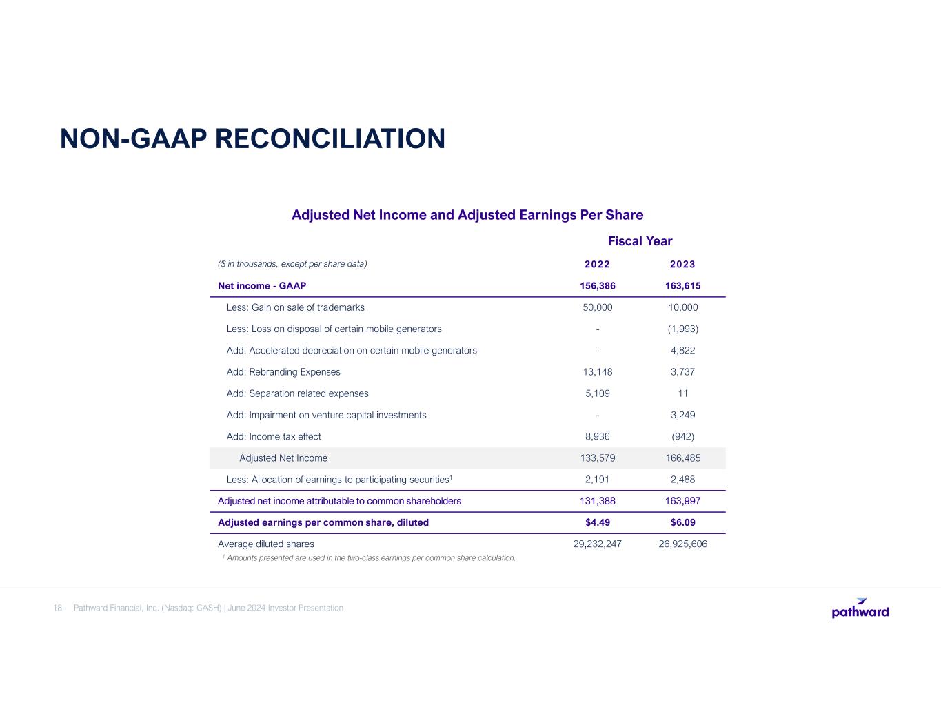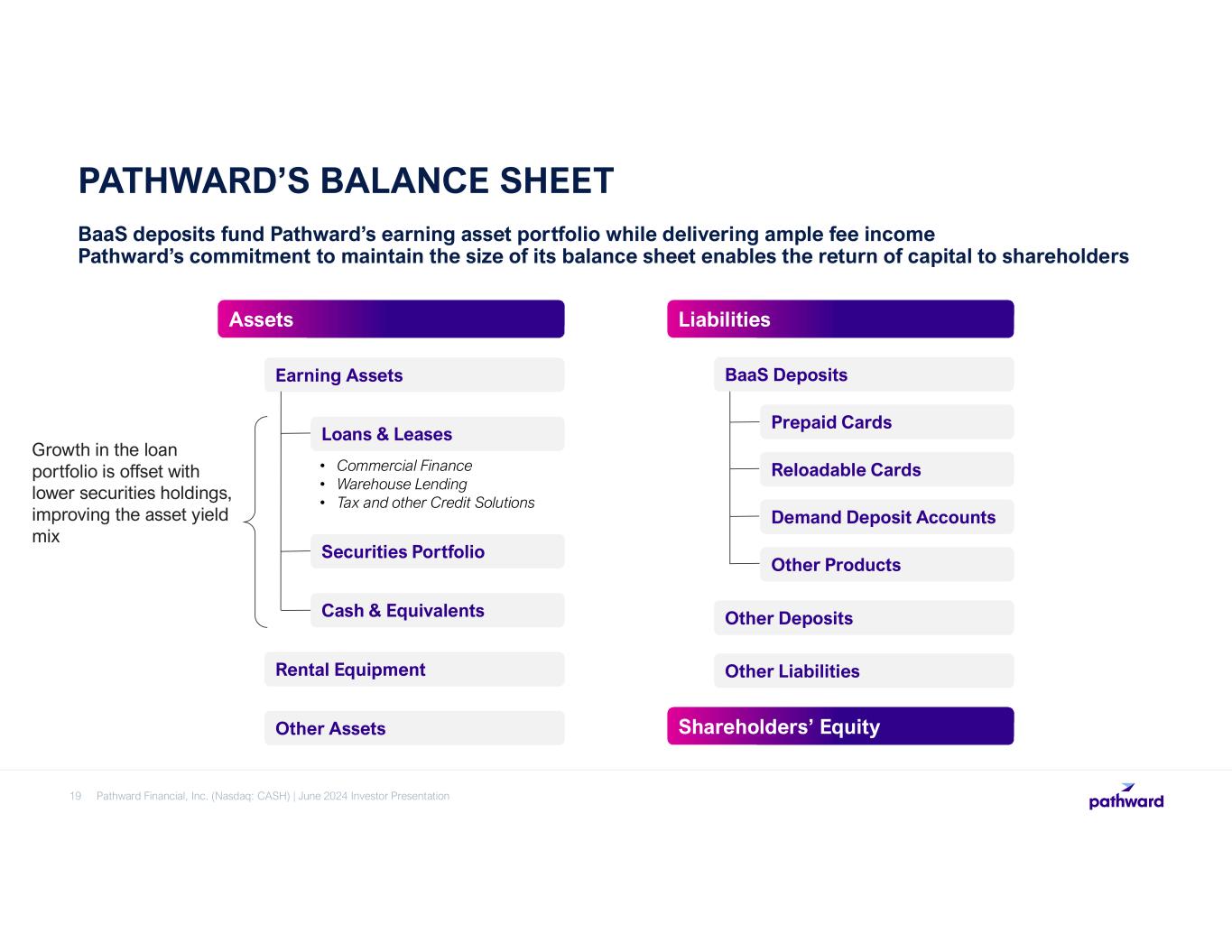 18 Adjusted Net Income and Adjusted Earnings Per Share Fiscal Year ($ in thousands, except per share data) 2022 2023 Net income - GAAP 156,386 163,615 Less: Gain on sale of trademarks 50,000 10,000 Less: Loss on disposal of certain mobile generators - (1,993) Add: Accelerated depreciation on certain mobile generators - 4,822 Add: Rebranding Expenses 13,148 3,737 Add: Separation related expenses 5,109 11 Add: Impairment on venture capital investments - 3,249 Add: Income tax effect 8,936 (942) Adjusted Net Income 133,579 166,485 Less: Allocation of earnings to participating securities1 2,191 2,488 Adjusted net income attributable to common shareholders 131,388 163,997 Adjusted earnings per common share, diluted $4.49 $6.09 Average diluted shares 29,232,247 26,925,606 1 Amounts presented are used in the two-class earnings per common share calculation. NON-GAAP RECONCILIATION Pathward Financial, Inc. (Nasdaq: CASH) | June 2024 Investor Presentation