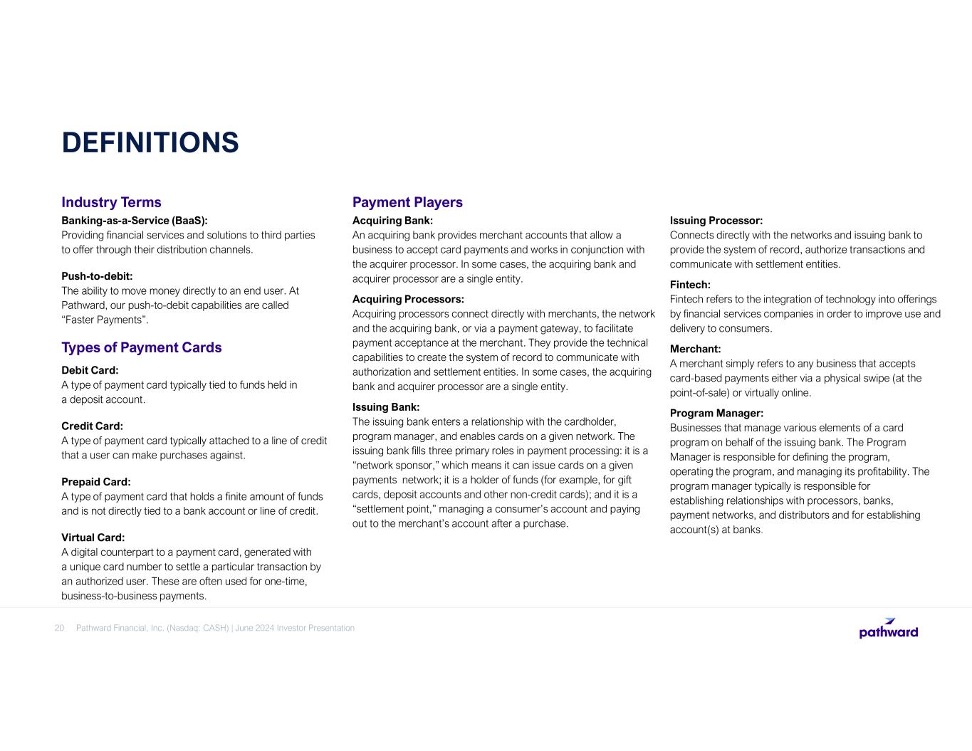 Industry Terms 20 Types of Payment Cards Banking-as-a-Service (BaaS): Providing financial services and solutions to third parties to offer through their distribution channels. Push-to-debit: The ability to move money directly to an end user. At Pathward, our push-to-debit capabilities are called “Faster Payments”. Debit Card: A type of payment card typically tied to funds held in a deposit account. Credit Card: A type of payment card typically attached to a line of credit that a user can make purchases against. Prepaid Card: A type of payment card that holds a finite amount of funds and is not directly tied to a bank account or line of credit. Virtual Card: A digital counterpart to a payment card, generated with a unique card number to settle a particular transaction by an authorized user. These are often used for one-time, business-to-business payments. Payment Players Acquiring Bank: An acquiring bank provides merchant accounts that allow a business to accept card payments and works in conjunction with the acquirer processor. In some cases, the acquiring bank and acquirer processor are a single entity. Acquiring Processors: Acquiring processors connect directly with merchants, the network and the acquiring bank, or via a payment gateway, to facilitate payment acceptance at the merchant. They provide the technical capabilities to create the system of record to communicate with authorization and settlement entities. In some cases, the acquiring bank and acquirer processor are a single entity. Issuing Bank: The issuing bank enters a relationship with the cardholder, program manager, and enables cards on a given network. The issuing bank fills three primary roles in payment processing: it is a “network sponsor,” which means it can issue cards on a given payments network; it is a holder of funds (for example, for gift cards, deposit accounts and other non-credit cards); and it is a “settlement point,” managing a consumer’s account and paying out to the merchant’s account after a purchase. Issuing Processor: Connects directly with the networks and issuing bank to provide the system of record, authorize transactions and communicate with settlement entities. Fintech: Fintech refers to the integration of technology into offerings by financial services companies in order to improve use and delivery to consumers. Merchant: A merchant simply refers to any business that accepts card-based payments either via a physical swipe (at the point-of-sale) or virtually online. Program Manager: Businesses that manage various elements of a card program on behalf of the issuing bank. The Program Manager is responsible for defining the program, operating the program, and managing its profitability. The program manager typically is responsible for establishing relationships with processors, banks, payment networks, and distributors and for establishing account(s) at banks. DEFINITIONS Pathward Financial, Inc. (Nasdaq: CASH) | June 2024 Investor Presentation