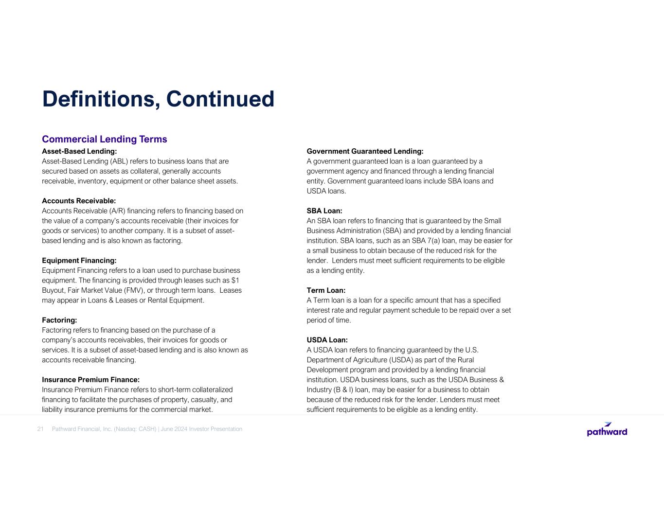 21 Asset-Based Lending: Asset-Based Lending (ABL) refers to business loans that are secured based on assets as collateral, generally accounts receivable, inventory, equipment or other balance sheet assets. Accounts Receivable: Accounts Receivable (A/R) financing refers to financing based on the value of a company’s accounts receivable (their invoices for goods or services) to another company. It is a subset of asset- based lending and is also known as factoring. Equipment Financing: Equipment Financing refers to a loan used to purchase business equipment. The financing is provided through leases such as $1 Buyout, Fair Market Value (FMV), or through term loans. Leases may appear in Loans & Leases or Rental Equipment. Factoring: Factoring refers to financing based on the purchase of a company’s accounts receivables, their invoices for goods or services. It is a subset of asset-based lending and is also known as accounts receivable financing. Insurance Premium Finance: Insurance Premium Finance refers to short-term collateralized financing to facilitate the purchases of property, casualty, and liability insurance premiums for the commercial market. Government Guaranteed Lending: A government guaranteed loan is a loan guaranteed by a government agency and financed through a lending financial entity. Government guaranteed loans include SBA loans and USDA loans. SBA Loan: An SBA loan refers to financing that is guaranteed by the Small Business Administration (SBA) and provided by a lending financial institution. SBA loans, such as an SBA 7(a) loan, may be easier for a small business to obtain because of the reduced risk for the lender. Lenders must meet sufficient requirements to be eligible as a lending entity. Term Loan: A Term loan is a loan for a specific amount that has a specified interest rate and regular payment schedule to be repaid over a set period of time. USDA Loan: A USDA loan refers to financing guaranteed by the U.S. Department of Agriculture (USDA) as part of the Rural Development program and provided by a lending financial institution. USDA business loans, such as the USDA Business & Industry (B & I) loan, may be easier for a business to obtain because of the reduced risk for the lender. Lenders must meet sufficient requirements to be eligible as a lending entity. Commercial Lending Terms Definitions, Continued Pathward Financial, Inc. (Nasdaq: CASH) | June 2024 Investor Presentation