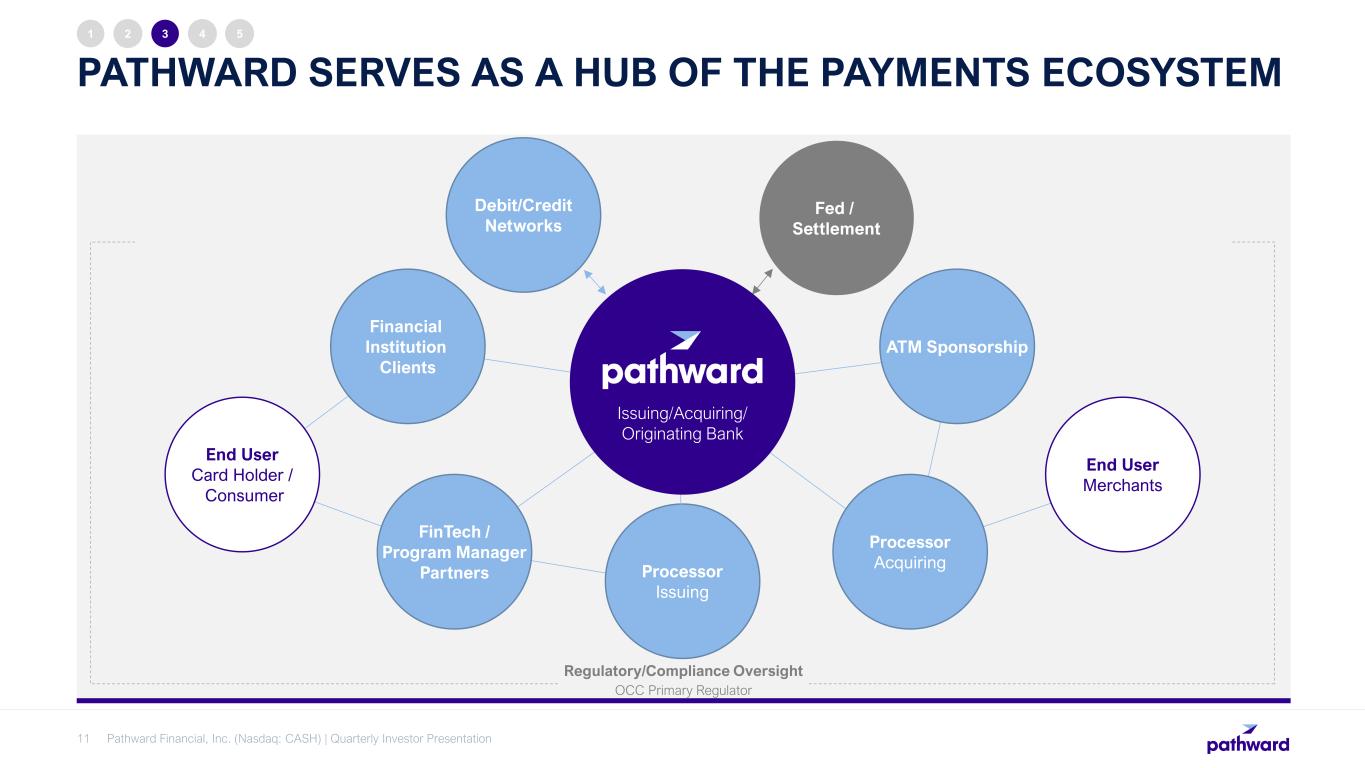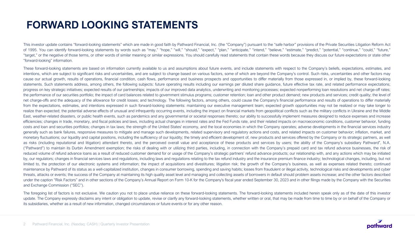 Pathward Financial, Inc. (Nasdaq: CASH) | Quarterly Investor Presentation2 FORWARD LOOKING STATEMENTS This investor update contains “forward-looking statements” which are made in good faith by Pathward Financial, Inc. (the “Company”) pursuant to the “safe harbor” provisions of the Private Securities Litigation Reform Act of 1995. You can identify forward-looking statements by words such as “may,” “hope,” “will,” “should,” “expect,” “plan,” “anticipate,” “intend,” “believe,” “estimate,” “predict,” “potential,” “continue,” “could,” “future,” “target,” or the negative of those terms, or other words of similar meaning or similar expressions. You should carefully read statements that contain these words because they discuss our future expectations or state other “forward-looking” information. These forward-looking statements are based on information currently available to us and assumptions about future events, and include statements with respect to the Company’s beliefs, expectations, estimates, and intentions, which are subject to significant risks and uncertainties, and are subject to change based on various factors, some of which are beyond the Company’s control. Such risks, uncertainties and other factors may cause our actual growth, results of operations, financial condition, cash flows, performance and business prospects and opportunities to differ materially from those expressed in, or implied by, these forward-looking statements. Such statements address, among others, the following subjects: future operating results including our earnings per diluted share guidance, future effective tax rate, and related performance expectations; progress on key strategic initiatives; expected results of our partnerships; impacts of our improved data analytics, underwriting and monitoring processes; expected nonperforming loan resolutions and net charge-off rates; the performance of our securities portfolio; the impact of card balances related to government stimulus programs; customer retention; loan and other product demand; new products and services; credit quality; the level of net charge-offs and the adequacy of the allowance for credit losses; and technology. The following factors, among others, could cause the Company's financial performance and results of operations to differ materially from the expectations, estimates, and intentions expressed in such forward-looking statements: maintaining our executive management team; expected growth opportunities may not be realized or may take longer to realize than expected; the potential adverse effects of unusual and infrequently occurring events, including the impact on financial markets from geopolitical conflicts such as the military conflicts in Ukraine and the Middle East, weather-related disasters, or public health events, such as pandemics and any governmental or societal responses thereto; our ability to successfully implement measures designed to reduce expenses and increase efficiencies; changes in trade, monetary, and fiscal policies and laws, including actual changes in interest rates and the Fed Funds rate, and their related impacts on macroeconomic conditions, customer behavior, funding costs and loan and securities portfolios; changes in tax laws; the strength of the United States' economy, and the local economies in which the Company operates; adverse developments in the financial services industry generally such as bank failures, responsive measures to mitigate and manage such developments, related supervisory and regulatory actions and costs, and related impacts on customer behavior; inflation, market, and monetary fluctuations; our liquidity and capital positions, including the sufficiency of our liquidity; the timely and efficient development of, new products and services offered by the Company or its strategic partners, as well as risks (including reputational and litigation) attendant thereto, and the perceived overall value and acceptance of these products and services by users; the ability of the Company’s subsidiary Pathward®, N.A. (“Pathward”) to maintain its Durbin Amendment exemption; the risks of dealing with or utilizing third parties, including, in connection with the Company’s prepaid card and tax refund advance businesses, the risk of reduced volume of refund advance loans as a result of reduced customer demand for or usage of the Company’s strategic partners’ refund advance products; our relationship with, and any actions which may be initiated by, our regulators; changes in financial services laws and regulations, including laws and regulations relating to the tax refund industry and the insurance premium finance industry; technological changes, including, but not limited to, the protection of our electronic systems and information; the impact of acquisitions and divestitures; litigation risk; the growth of the Company’s business, as well as expenses related thereto; continued maintenance by Pathward of its status as a well-capitalized institution, changes in consumer borrowing, spending and saving habits; losses from fraudulent or illegal activity, technological risks and developments and cyber threats, attacks or events; the success of the Company at maintaining its high quality asset level and managing and collecting assets of borrowers in default should problem assets increase; and the other factors described under the caption “Risk Factors” and in other sections of the Company’s Annual Report on Form 10-K for the Company's fiscal year ended September 30, 2023 and in other filings made by the Company with the Securities and Exchange Commission (“SEC”). The foregoing list of factors is not exclusive. We caution you not to place undue reliance on these forward-looking statements. The forward-looking statements included herein speak only as of the date of this investor update. The Company expressly disclaims 