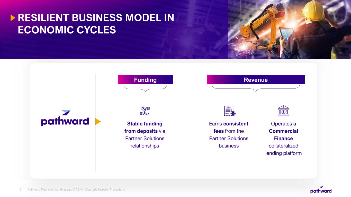 BUILDING A DIVERSIFIED COMPANY DEDICATED TO FINANCIAL EMPOWERMENT FOR INDIVIDUALS AND BUSINESSES 4 1993 Listed on Nasdaq: CASH 2015 / 2016 Entered Tax Services business by acquiring Refund Advantage, SCS, and EPS 2020 Completed sale of Retail Bank division to focus on national banking operations and payments Developed a governance structure that aligns with key ESG efforts Converted to National Bank Charter 2004 Created Prepaid Card Sponsorship business - now Partner Solutions 2014 Acquired AFS/IBEX, an insurance premium finance company 2018 Acquired Crestmark Bancorp, a commercial lending company Dramatic growth in deposits from Payments business heavily invested in securities, treasuries, and bond portfolio. 1954 Founded as a savings and loan bank 2021 Sold Meta trademarks and began rebranding initiative 2022 Completed rebranding as Pathward Financial 4 Pathward Financial, Inc. (Nasdaq: CASH) | Quarterly Investor Presentation 2024 Announced sale of Insurance Premium Finance business line to focus on higher return on asset verticals