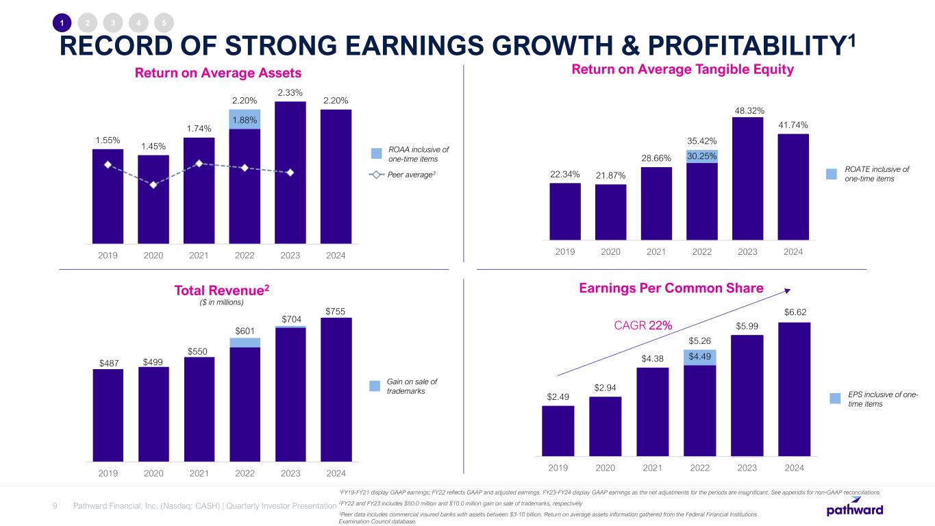 RECORD OF STRONG EARNINGS GROWTH AND PROFITABILITY ABOVE BANKING INDUSTRY AVERAGES EXCESS CAPITAL GENERATING BUSINESS ENABLES ONGOING RETURN OF VALUE TO SHAREHOLDERS INVESTMENT HIGHLIGHTS 2 3 4 1 5 EXPERIENCED LEADER IN FAST-GROWING PAYMENTS SECTOR, WITH DIVERSIFIED PORTFOLIO OF HIGH- QUALITY FINANCIAL PARTNERS RESILIENT COMMERCIAL FINANCE LOAN PORTFOLIO PRODUCES ATTRACTIVE RETURNS THROUGHOUT ECONOMIC CYCLES MATURE RISK MITIGATION AND COMPLIANCE CAPABILITIES WITH HIGHLY ADVANTAGEOUS NATIONAL BANK CHARTER 8 Pathward Financial, Inc. (Nasdaq: CASH) | Quarterly Investor Presentation