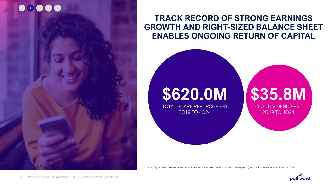 Earnings Per Common Share $5.26 $5.99 $2.49 $2.94 $4.38 $4.49 $6.62 2019 2020 2021 2022 2023 2024 EPS inclusive of one- time items CAGR 22% RECORD OF STRONG EARNINGS GROWTH & PROFITABILITY1 2.20% 1.55% 1.45% 1.74% 1.88% 2.33% 2.20% 2019 2020 2021 2022 2023 2024 Return on Average Assets ROAA inclusive of one-time items Total Revenue2 ($ in millions) Return on Average Tangible Equity 35.42% 22.34% 21.87% 28.66% 30.25% 48.32% 41.74% 2019 2020 2021 2022 2023 2024 ROATE inclusive of one-time items 1FY19-FY21 display GAAP earnings; FY22 reflects GAAP and adjusted earnings. FY23-FY24 display GAAP earnings as the net adjustments for the periods are insignificant. See appendix for non-GAAP reconciliations $487 $499 $550 $601 $704 $755 2019 2020 2021 2022 2023 2024 Pathward Financial, Inc. (Nasdaq: CASH) | Quarterly Investor Presentation9 3Peer data includes commercial insured banks with assets between $3-10 billion. Return on average assets information gathered from the Federal Financial Institutions Examination Council database. Gain on sale of trademarks Peer average3 2FY22 and FY23 includes $50.0 million and $10.0 million gain on sale of trademarks, respectively 1 2 3 4 5