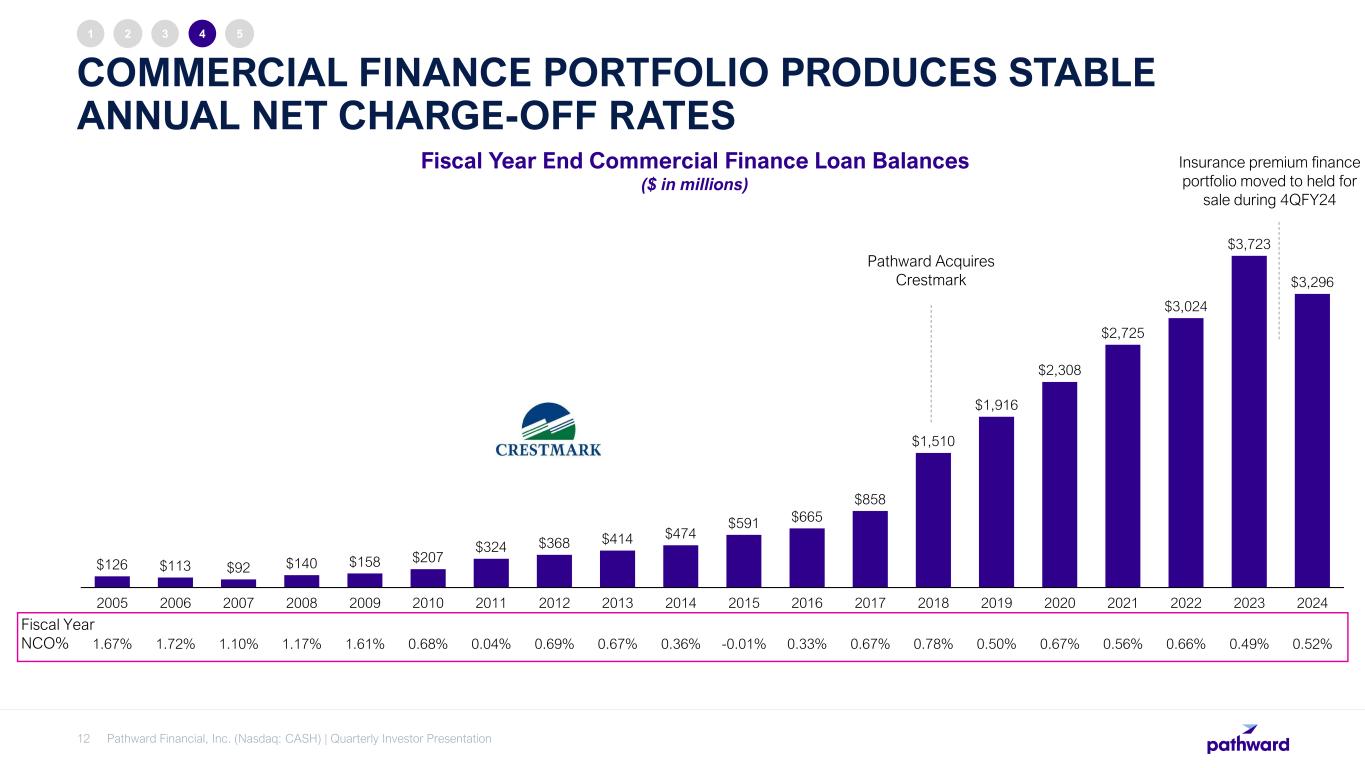 COMMERCIAL FINANCE PORTFOLIO PRODUCES STABLE ANNUAL NET CHARGE-OFF RATES 12 Fiscal Year End Commercial Finance Loan Balances ($ in millions) $126 $113 $92 $140 $158 $207 $324 $368 $414 $474 $591 $665 $858 $1,510 $1,916 $2,308 $2,725 $3,024 $3,723 $3,296 0 0 0 0 0 0 0 0 0 0 1 0 500 1,000 1,500 2,000 2,500 3,000 3,500 4,000 2005 1.67% 2006 1.72% 2007 1.10% 2008 1.17% 2009 1.61% 2010 0.68% 2011 0.04% 2012 0.69% 2013 0.67% 2014 0.36% 2015 -0.01% 2016 0.33% 2017 0.67% 2018 0.78% 2019 0.50% 2020 0.67% 2021 0.56% 2022 0.66% 2023 0.49% 2024 0.52% Fiscal Year NCO% 1 2 3 4 5 Pathward Acquires Crestmark Pathward Financial, Inc. (Nasdaq: CASH) | Quarterly Investor Presentation Insurance premium finance portfolio moved to held for sale during 4QFY24