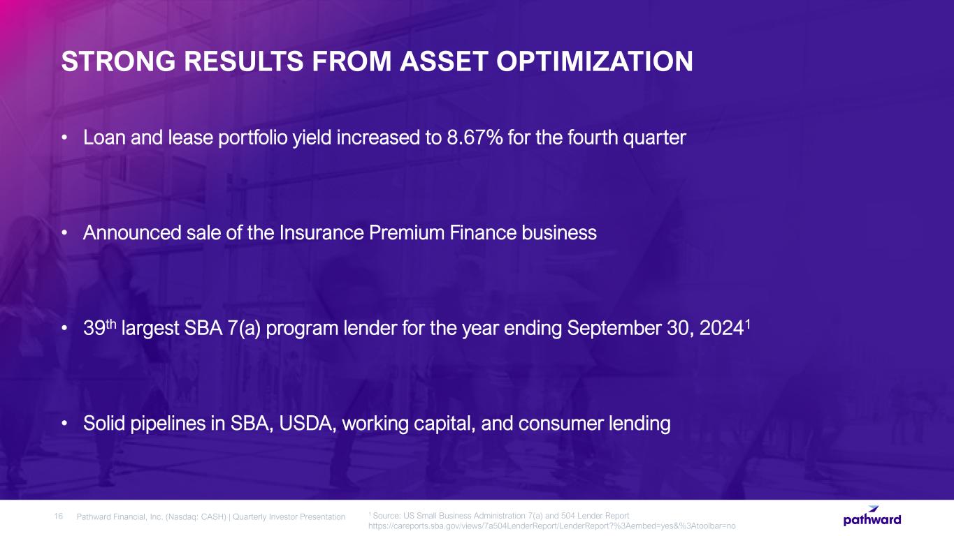 Net Income $168.4 million in net income; an increase of 3% compared to FY 2023 Diluted Earnings Per Share $6.62 in diluted earnings per share; an increase of 11% compared to FY 2023 Net Interest Margin Net interest margin (“NIM”) of 6.41% compared to 6.04% in prior year; Adjusted NIM1, including contractual, rate- related processing expenses, of 4.85% compared to 4.83% in prior year period Return Metrics2 FY 2024 return on average assets (“ROAA”) of 2.20% compared to 2.33% in prior year period; FY 2024 return on average tangible equity (“ROATE”) of 41.74% compared to 48.32% in prior year period FY 2024 HIGHLIGHTS Pathward Financial, Inc. (Nasdaq: CASH) | Quarterly Investor Presentation15 1 See slide 42 for reconciliation to most directly comparable GAAP measure. 2 ROAA and ROATE are annualized for periods presented.
