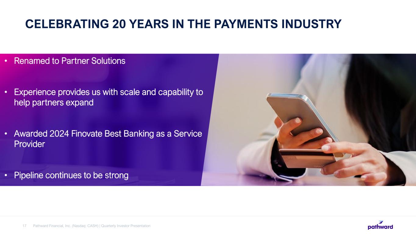 • Renamed to Partner Solutions • Experience provides us with scale and capability to help partners expand • Awarded 2024 Finovate Best Banking as a Service Provider • Pipeline continues to be strong CELEBRATING 20 YEARS IN THE PAYMENTS INDUSTRY Pathward Financial, Inc. (Nasdaq: CASH) | Quarterly Investor Presentation17