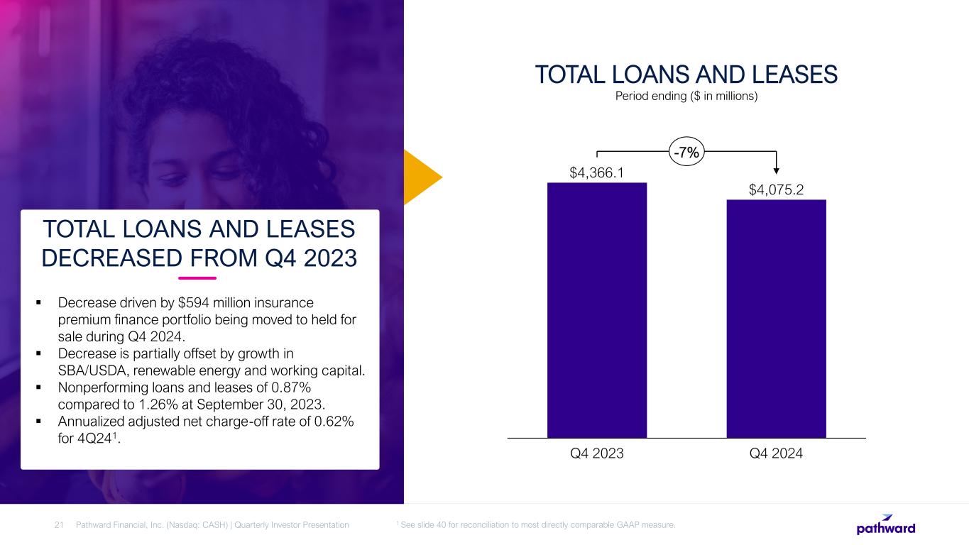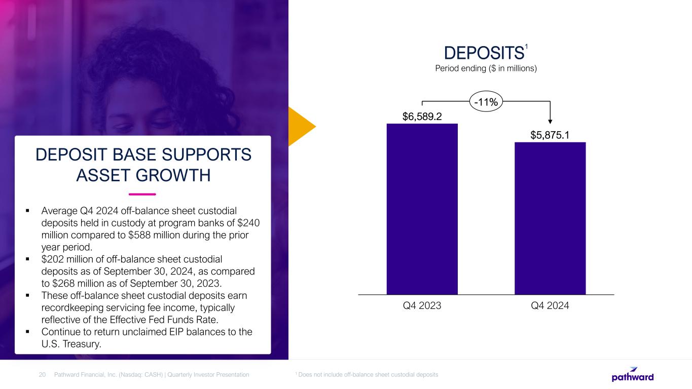  Average Q4 2024 off-balance sheet custodial deposits held in custody at program banks of $240 million compared to $588 million during the prior year period.  $202 million of off-balance sheet custodial deposits as of September 30, 2024, as compared to $268 million as of September 30, 2023.  These off-balance sheet custodial deposits earn recordkeeping servicing fee income, typically reflective of the Effective Fed Funds Rate.  Continue to return unclaimed EIP balances to the U.S. Treasury. DEPOSIT BASE SUPPORTS ASSET GROWTH Q4 2023 Q4 2024 $6,589.2 $5,875.1 -11% DEPOSITS 1 Period ending ($ in millions) Pathward Financial, Inc. (Nasdaq: CASH) | Quarterly Investor Presentation20 1 Does not include off-balance sheet custodial deposits