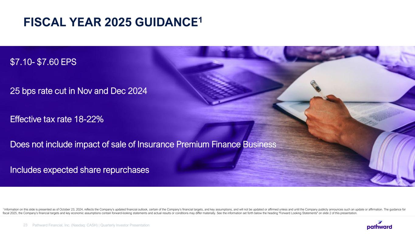 FISCAL YEAR 2025 GUIDANCE1 Pathward Financial, Inc. (Nasdaq: CASH) | Quarterly Investor Presentation23 $7.10- $7.60 EPS 25 bps rate cut in Nov and Dec 2024 Effective tax rate 18-22% Includes expected share repurchases 1 Information on this slide is presented as of October 23, 2024, reflects the Company’s updated financial outlook, certain of the Company’s financial targets, and key assumptions, and will not be updated or affirmed unless and until the Company publicly announces such an update or affirmation. The guidance for fiscal 2025, the Company’s financial targets and key economic assumptions contain forward-looking statements and actual results or conditions may differ materially. See the information set forth below the heading "Forward Looking Statements" on slide 2 of this presentation. Does not include impact of sale of Insurance Premium Finance Business