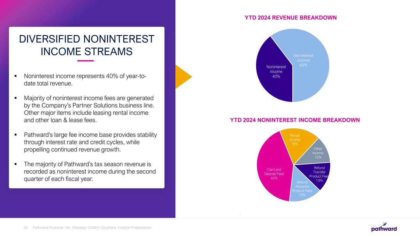  Noninterest income represents 40% of year-to- date total revenue.  Majority of noninterest income fees are generated by the Company’s Partner Solutions business line. Other major items include leasing rental income and other loan & lease fees.  Pathward’s large fee income base provides stability through interest rate and credit cycles, while propelling continued revenue growth.  The majority of Pathward’s tax season revenue is recorded as noninterest income during the second quarter of each fiscal year. DIVERSIFIED NONINTEREST INCOME STREAMS Pathward Financial, Inc. (Nasdaq: CASH) | Quarterly Investor Presentation25 Refund Transfer Product Fees 13%Refund Advance Product Fees 15% Card and Deposit Fees 42% Rental Income 18% Other Income 12% YTD 2024 NONINTEREST INCOME BREAKDOWN . Noninterest income 40% Net interest income 60% YTD 2024 REVENUE BREAKDOWN