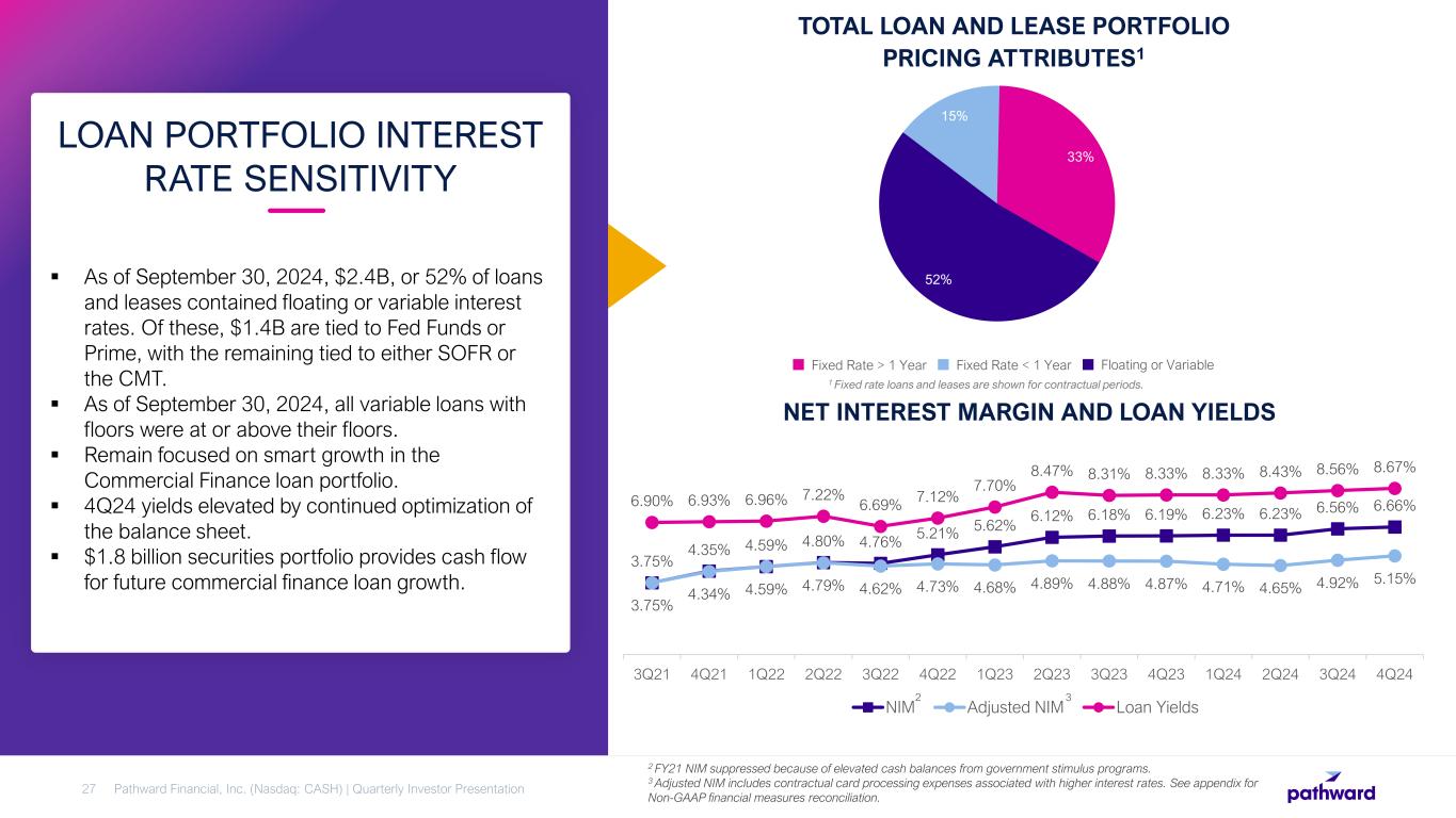 During the 2024 fiscal fourth quarter, approximately 57% of the deposit balances were subject to variable card processing expenses, derived from contractual agreements with certain Partner Solutions relationships tied to a rate index, typically the Effective Fed Funds Rate.  These costs reprice immediately upon a change in the applicable rate index, leading to an instant cost change as compared to the earning-asset yields that will generally experience a lag in repricing.  As of September 30, 2024, Pathward also managed $202 million in off-balance sheet custodial deposits and earned $3.2 million of recordkeeping servicing fee income during the fiscal fourth quarter. That income is also typically reflective of the Effective Fed Funds Rate. COST OF DEPOSITS Pathward Financial, Inc. (Nasdaq: CASH) | Quarterly Investor Presentation26 COST OF DEPOSITS 1.76% 1.66% 5.26% 4Q21 1Q22 2Q22 3Q22 4Q22 1Q23 2Q23 3Q23 4Q23 1Q24 2Q24 3Q24 4Q24 All-in Cost of Deposits Cost of Interest Bearing Deposits Quarterly Average Effective Fed Funds Rate Note: All-in Cost of Deposits represents cost of total deposits with the additional incorporation of the Company’s noninterest variable card processing expenses impacted by interest rates.
