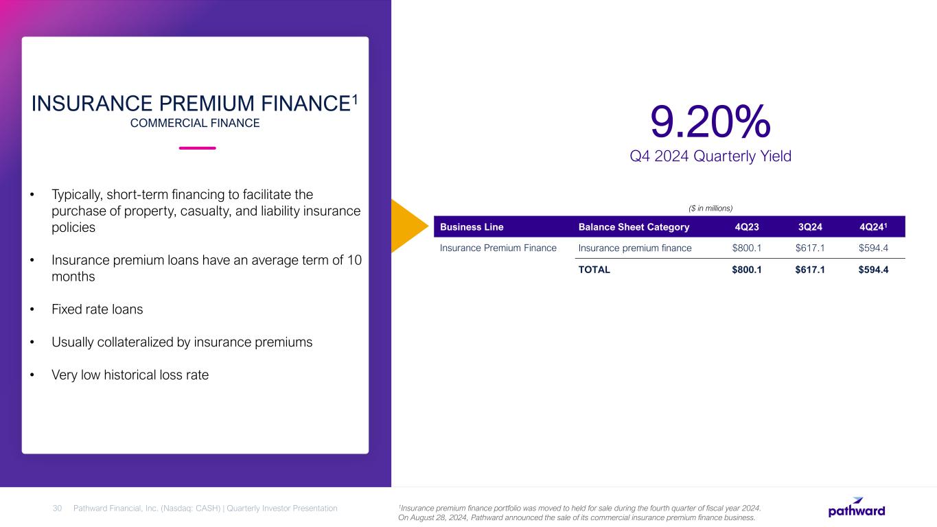 • Provides working capital for companies to meet short- term operational requirements • Primarily variable rate loans with majority of floors at or above 6% • Bank typically has dominion of funds • Heavily collateral-managed • Historically excels during economic downturns WORKING CAPITAL FINANCE COMMERCIAL FINANCE Pathward Financial, Inc. (Nasdaq: CASH) | Quarterly Investor Presentation29 12.98% Q4 2024 Quarterly Yield 20% Of Loan Portfolio Business Line Balance Sheet Category 4Q23 3Q24 4Q24 Working Capital Asset-based lending $382.4 $473.3 $471.9 Factoring 358.3 350.7 362.3 TOTAL $740.7 $824.0 $834.2 ($ in millions)