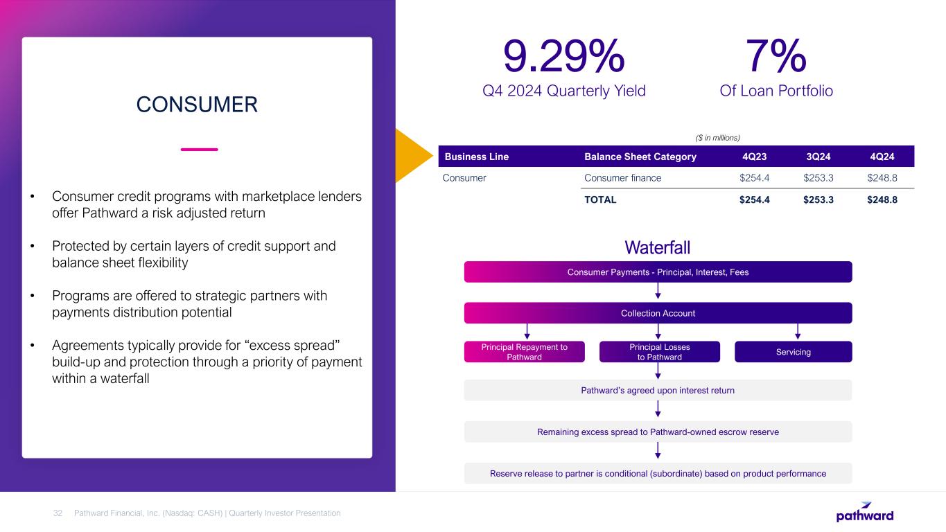 • Funding small and midsized businesses, including rural borrowers • SBA, USDA, and conventional loans with fixed or variable interest rates • Debt refinance, leveraged acquisitions, and alternative energy project finance • SBA and USDA guarantees can be sold on the secondary market STRUCTURED FINANCE COMMERCIAL FINANCE Pathward Financial, Inc. (Nasdaq: CASH) | Quarterly Investor Presentation31 6.56% Q4 2024 Quarterly Yield1 36% Of Loan Portfolio ($ in millions) Business Line Balance Sheet Category 4Q23 3Q24 4Q24 Guaranteed portion of US govt SBA/USDA loans SBA/USDA $342.5 $357.0 $344.4 Unguaranteed portion of US govt SBA/USDA loans SBA/USDA 182.3 206.7 224.2 Renewable energy debt financing2 (term lending only) Term lending 268.1 593.7 635.7 Other Term lending 322.8 260.6 308.6 TOTAL $1,115.7 $1,418.0 $1,512.9 2Total renewable energy debt financing outstanding was $1.21 billion as of 4Q24. The majority of these balances are in the term lending and SBA/USDA balance sheet categories. 1Interest income does not include any gain(loss) on sale of loans.
