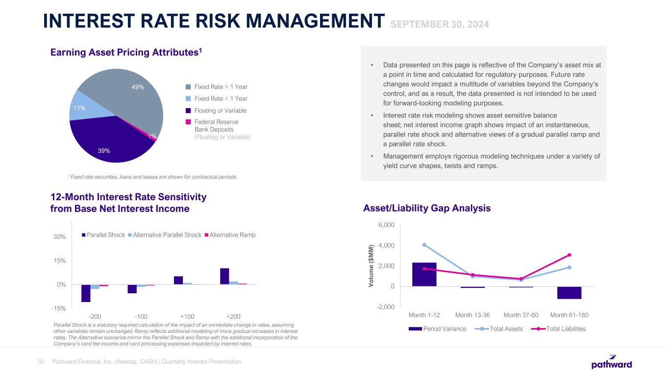 Pathward Financial, Inc. (Nasdaq: CASH) | Quarterly Investor Presentation35 INTEREST RATE RISK MANAGEMENT SEPTEMBER 30, 2024 Asset/Liability Gap Analysis 1 Fixed rate securities, loans and leases are shown for contractual periods. 1% 39% 11% 49% Fixed Rate > 1 Year Earning Asset Pricing Attributes1 Fixed Rate < 1 Year Floating or Variable Federal Reserve Bank Deposits (Floating or Variable) • Data presented on this page is reflective of the Company’s asset mix at a point in time and calculated for regulatory purposes. Future rate changes would impact a multitude of variables beyond the Company’s control, and as a result, the data presented is not intended to be used for forward-looking modeling purposes. • Interest rate risk modeling shows asset sensitive balance sheet; net interest income graph shows impact of an instantaneous, parallel rate shock and alternative views of a gradual parallel ramp and a parallel rate shock. • Management employs rigorous modeling techniques under a variety of yield curve shapes, twists and ramps. -15% 0% 15% 30% -200 -100 +100 +200 Parallel Shock Alternative Parallel Shock Alternative Ramp 12-Month Interest Rate Sensitivity from Base Net Interest Income Parallel Shock is a statutory required calculation of the impact of an immediate change in rates, assuming other variables remain unchanged. Ramp reflects additional modeling of more gradual increases in interest rates. The Alternative scenarios mirror the Parallel Shock and Ramp with the additional incorporation of the Company’s card fee income and card processing expenses impacted by interest rates. -2,000 0 2,000 4,000 6,000 Month 1-12 Month 13-36 Month 37-60 Month 61-180 V o lu m e ($ M M ) Period Variance Total Assets Total Liabilities