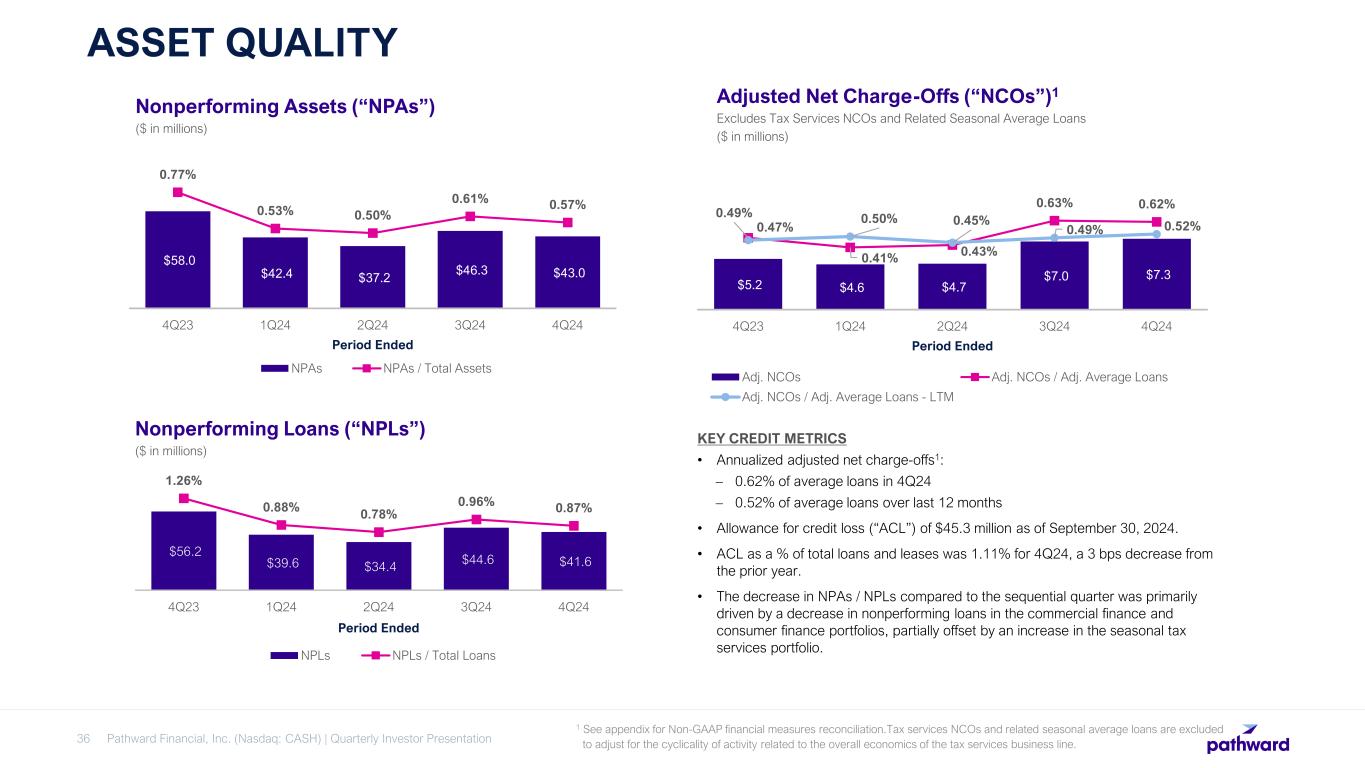 Pathward Financial, Inc. (Nasdaq: CASH) | Quarterly Investor Presentation36 ASSET QUALITY $5.2 $4.6 $4.7 $7.0 $7.3 0.49% 0.41% 0.43% 0.63% 0.62% 0.47% 0.50% 0.45% 0.49% 0.52% 4Q23 1Q24 2Q24 3Q24 4Q24 Period Ended Adj. NCOs Adj. NCOs / Adj. Average Loans Adj. NCOs / Adj. Average Loans - LTM Adjusted Net Charge-Offs (“NCOs”)1 Excludes Tax Services NCOs and Related Seasonal Average Loans ($ in millions) KEY CREDIT METRICS • Annualized adjusted net charge-offs1: – 0.62% of average loans in 4Q24 – 0.52% of average loans over last 12 months • Allowance for credit loss (“ACL”) of $45.3 million as of September 30, 2024. • ACL as a % of total loans and leases was 1.11% for 4Q24, a 3 bps decrease from the prior year. • The decrease in NPAs / NPLs compared to the sequential quarter was primarily driven by a decrease in nonperforming loans in the commercial finance and consumer finance portfolios, partially offset by an increase in the seasonal tax services portfolio. 1 See appendix for Non-GAAP financial measures reconciliation.Tax services NCOs and related seasonal average loans are excluded to adjust for the cyclicality of activity related to the overall economics of the tax services business line. $56.2 $39.6 $34.4 $44.6 $41.6 1.26% 0.88% 0.78% 0.96% 0.87% 4Q23 1Q24 2Q24 3Q24 4Q24 Period Ended NPLs NPLs / Total Loans Nonperforming Assets (“NPAs”) ($ in millions) Nonperforming Loans (“NPLs”) ($ in millions) $58.0 $42.4 $37.2 $46.3 $43.0 0.77% 0.53% 0.50% 0.61% 0.57% 4Q23 1Q24 2Q24 3Q24 4Q24 Period Ended NPAs NPAs / Total Assets