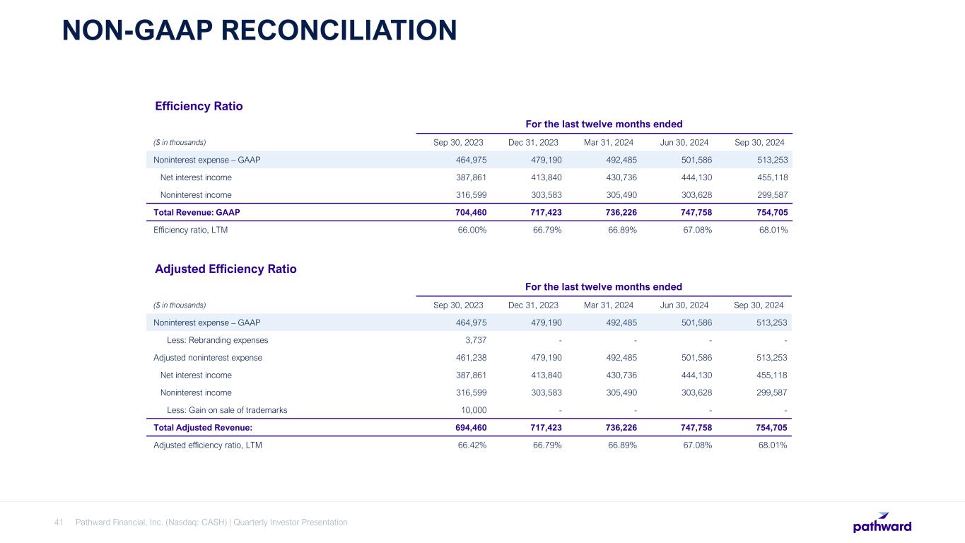 Pathward Financial, Inc. (Nasdaq: CASH) | Quarterly Investor Presentation40 NON-GAAP RECONCILIATION 1 Tax services NCOs and average loans are excluded to adjust for the cyclicality of activity related to the overall economics of the Company's tax services business line. For the quarter ended ($ in thousands) Sep 30, 2023 Dec 31, 2023 Mar 31, 2024 Jun 30, 2024 Sep 30, 2024 Net charge-offs 41,280 5,486 (1,087) 6,582 35,626 Less: Tax services net charge-offs (recoveries) 36,075 851 (5,800) (410) 28,354 Adjusted net charge-offs 5,205 4,635 4,713 6,992 7,272 Quarterly average loans and leases 4,288,067 4,535,826 4,903,175 4,506,674 4,694,512 Less: Quarterly average tax services loans 44,192 28,050 493,168 56,836 39,437 Adjusted quarterly average loans and leases 4,243,875 4,507,776 4,410,007 4,449,838 4,655,075 Annualized NCOs/average loans and leases 3.85% 0.48% -0.09% 0.58% 3.04% Adjusted annualized NCOs/adjusted average loans and leases1 0.49% 0.41% 0.43% 0.63% 0.62% Adjusted Annualized NCOs and Adjusted Average Loans and Leases For the last twelve months ended ($ in thousands) Sep 30, 2023 Dec 31, 2023 Mar 31, 2024 Jun 30, 2024 Sep 30, 2024 Net charge-offs 53,690 55,959 49,897 52,261 46,607 Less: Tax services net charge-offs (recoveries) 35,779 35,597 30,860 30,716 22,995 Adjusted net charge-offs 17,911 20,362 19,037 21,545 23,612 Average loans and leases 3,936,582 4,189,308 4,411,573 4,558,436 4,660,047 Less: average tax services loans 142,640 143,345 154,472 155,561 154,373 Adjusted average loans and leases 3,793,943 4,045,963 4,257,104 4,402,874 4,505,674 NCOs/average loans and leases 1.36% 1.34% 1.13% 1.15% 1.00% Adjusted NCOs/adjusted average loans and leases1 0.47% 0.50% 0.45% 0.49% 0.52%