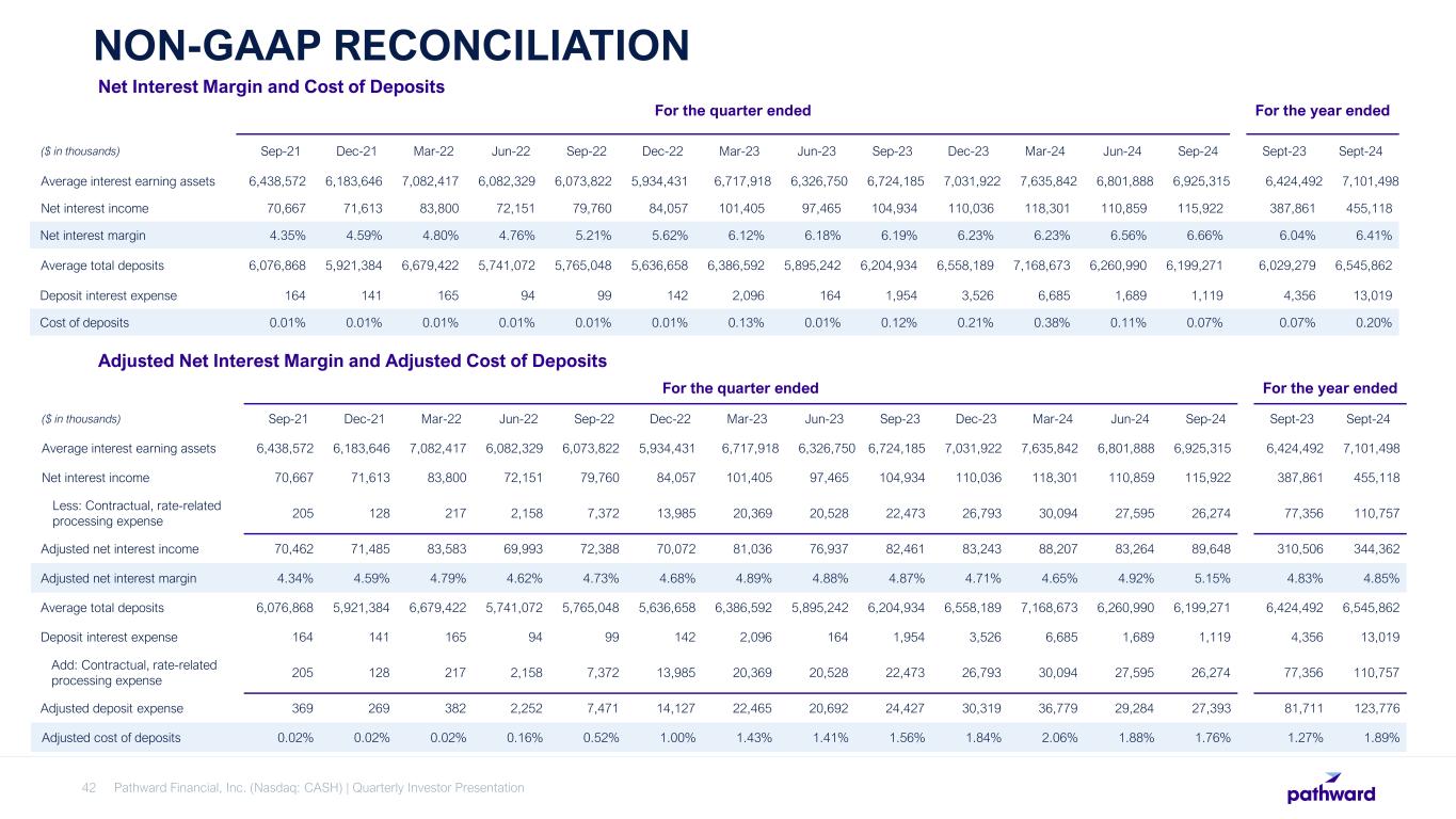 Pathward Financial, Inc. (Nasdaq: CASH) | Quarterly Investor Presentation42 NON-GAAP RECONCILIATION For the quarter ended For the year ended ($ in thousands) Sep-21 Dec-21 Mar-22 Jun-22 Sep-22 Dec-22 Mar-23 Jun-23 Sep-23 Dec-23 Mar-24 Jun-24 Sep-24 Sept-23 Sept-24 Average interest earning assets 6,438,572 6,183,646 7,082,417 6,082,329 6,073,822 5,934,431 6,717,918 6,326,750 6,724,185 7,031,922 7,635,842 6,801,888 6,925,315 6,424,492 7,101,498 Net interest income 70,667 71,613 83,800 72,151 79,760 84,057 101,405 97,465 104,934 110,036 118,301 110,859 115,922 387,861 455,118 Net interest margin 4.35% 4.59% 4.80% 4.76% 5.21% 5.62% 6.12% 6.18% 6.19% 6.23% 6.23% 6.56% 6.66% 6.04% 6.41% Average total deposits 6,076,868 5,921,384 6,679,422 5,741,072 5,765,048 5,636,658 6,386,592 5,895,242 6,204,934 6,558,189 7,168,673 6,260,990 6,199,271 6,029,279 6,545,862 Deposit interest expense 164 141 165 94 99 142 2,096 164 1,954 3,526 6,685 1,689 1,119 4,356 13,019 Cost of deposits 0.01% 0.01% 0.01% 0.01% 0.01% 0.01% 0.13% 0.01% 0.12% 0.21% 0.38% 0.11% 0.07% 0.07% 0.20% Net Interest Margin and Cost of Deposits Adjusted Net Interest Margin and Adjusted Cost of Deposits For the quarter ended For the year ended ($ in thousands) Sep-21 Dec-21 Mar-22 Jun-22 Sep-22 Dec-22 Mar-23 Jun-23 Sep-23 Dec-23 Mar-24 Jun-24 Sep-24 Sept-23 Sept-24 Average interest earning assets 6,438,572 6,183,646 7,082,417 6,082,329 6,073,822 5,934,431 6,717,918 6,326,750 6,724,185 7,031,922 7,635,842 6,801,888 6,925,315 6,424,492 7,101,498 Net interest income 70,667 71,613 83,800 72,151 79,760 84,057 101,405 97,465 104,934 110,036 118,301 110,859 115,922 387,861 455,118 Less: Contractual, rate-related processing expense 205 128 217 2,158 7,372 13,985 20,369 20,528 22,473 26,793 30,094 27,595 26,274 77,356 110,757 Adjusted net interest income 70,462 71,485 83,583 69,993 72,388 70,072 81,036 76,937 82,461 83,243 88,207 83,264 89,648 310,506 344,362 Adjusted net interest margin 4.34% 4.59% 4.79% 4.62% 4.73% 4.68% 4.89% 4.88% 4.87% 4.71% 4.65% 4.92% 5.15% 4.83% 4.85% Average total deposits 6,076,868 5,921,384 6,679,422 5,741,072 5,765,048 5,636,658 6,386,592 5,895,242 6,204,934 6,558,189 7,168,673 6,260,990 6,199,271 6,424,492 6,545,862 Deposit interest expense 164 141 165 94 99 142 2,096 164 1,954 3,526 6,685 1,689 1,119 4,356 13,019 Add: Contractual, rate-related processing expense 205 128 217 2,158 7,372 13,985 20,369 20,528 22,473 26,793 30,094 27,595 26,274 77,356 110,757 Adjusted deposit expense 369 269 382 2,252 7,471 14,127 22,465 20,692 24,427 30,319 36,779 29,284 27,393 81,711 123,776 Adjusted cost of deposits 0.02% 0.02% 0.02% 0.16% 0.52% 1.00% 1.43% 1.41% 1.56% 1.84% 2.06% 1.88% 1.76% 1.27% 1.89%