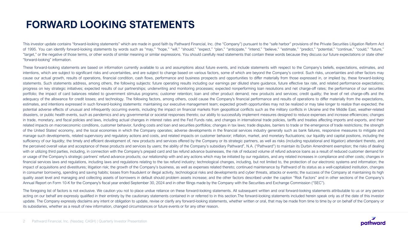 Pathward Financial, Inc. (Nasdaq: CASH) | Quarterly Investor Presentation2 FORWARD LOOKING STATEMENTS This investor update contains “forward-looking statements” which are made in good faith by Pathward Financial, Inc. (the “Company”) pursuant to the “safe harbor” provisions of the Private Securities Litigation Reform Act of 1995. You can identify forward-looking statements by words such as “may,” “hope,” “will,” “should,” “expect,” “plan,” “anticipate,” “intend,” “believe,” “estimate,” “predict,” “potential,” “continue,” “could,” “future,” “target,” or the negative of those terms, or other words of similar meaning or similar expressions. You should carefully read statements that contain these words because they discuss our future expectations or state other “forward-looking” information. These forward-looking statements are based on information currently available to us and assumptions about future events, and include statements with respect to the Company’s beliefs, expectations, estimates, and intentions, which are subject to significant risks and uncertainties, and are subject to change based on various factors, some of which are beyond the Company’s control. Such risks, uncertainties and other factors may cause our actual growth, results of operations, financial condition, cash flows, performance and business prospects and opportunities to differ materially from those expressed in, or implied by, these forward-looking statements. Such statements address, among others, the following subjects: future operating results including our earnings per diluted share guidance, future effective tax rate, and related performance expectations; progress on key strategic initiatives; expected results of our partnerships; underwriting and monitoring processes; expected nonperforming loan resolutions and net charge-off rates; the performance of our securities portfolio; the impact of card balances related to government stimulus programs; customer retention; loan and other product demand; new products and services; credit quality; the level of net charge-offs and the adequacy of the allowance for credit losses; and technology. The following factors, among others, could cause the Company's financial performance and results of operations to differ materially from the expectations, estimates, and intentions expressed in such forward-looking statements: maintaining our executive management team; expected growth opportunities may not be realized or may take longer to realize than expected; the potential adverse effects of unusual and infrequently occurring events, including the impact on financial markets from geopolitical conflicts such as the military conflicts in Ukraine and the Middle East, weather-related disasters, or public health events, such as pandemics and any governmental or societal responses thereto; our ability to successfully implement measures designed to reduce expenses and increase efficiencies; changes in trade, monetary, and fiscal policies and laws, including actual changes in interest rates and the Fed Funds rate, and changes in international trade policies, tariffs and treaties affecting imports and exports, and their related impacts on macroeconomic conditions, customer behavior, funding costs and loan and securities portfolios; changes in tax laws; trade disputes, barriers to trade or the emergence of trade restrictions; the strength of the United States' economy, and the local economies in which the Company operates; adverse developments in the financial services industry generally such as bank failures, responsive measures to mitigate and manage such developments, related supervisory and regulatory actions and costs, and related impacts on customer behavior; inflation, market, and monetary fluctuations; our liquidity and capital positions, including the sufficiency of our liquidity; the timely and efficient development of, new products and services offered by the Company or its strategic partners, as well as risks (including reputational and litigation) attendant thereto, and the perceived overall value and acceptance of these products and services by users; the ability of the Company’s subsidiary Pathward®, N.A. (“Pathward”) to maintain its Durbin Amendment exemption; the risks of dealing with or utilizing third parties, including, in connection with the Company’s prepaid card and tax refund advance businesses, the risk of reduced volume of refund advance loans as a result of reduced customer demand for or usage of the Company’s strategic partners’ refund advance products; our relationship with and any actions which may be initiated by our regulators, and any related increases in compliance and other costs; changes in financial services laws and regulations, including laws and regulations relating to the tax refund industry; technological changes, including, but not limited to, the protection of our electronic systems and information; the impact of acquisitions and divestitures; litigation risk; the growth of the Company’s business, as well as expenses related thereto; continued maintenance by Pathward of its status as a well-capitalized institution, changes in consumer borrowing, spending and saving habits; losses from fraudulent or illegal activity, technological risks and developments and cyber threats, attacks or events; the success of the Company at maintaining its high quality asset level and managing and collecting assets of borrowers in default should problem assets increase; and the other factors described under the caption “Risk Factors” and in other sections of the Company’s Annual Report on Form 10-K for the Company's fiscal year ended September 30, 2024 and in other filings made by the Company with the Securities and Exchange Commission (“SEC”). The foregoing list of factors is not exclusive. We caution you not to place undue reliance on these forward-looking