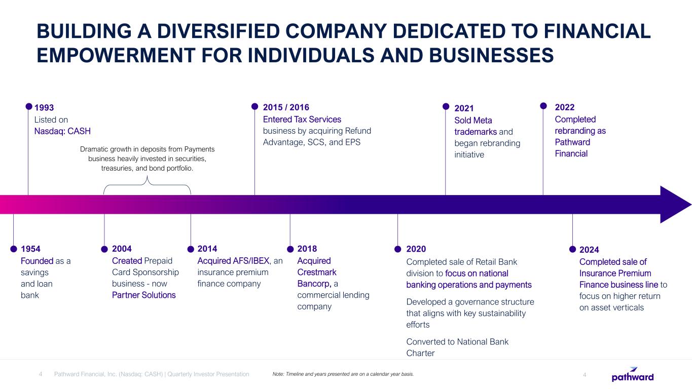 Since our founding, we have worked to advance financial inclusion. We seek out diverse partners, including fintechs, affinity groups, government agencies, and other banks and work with them to identify markets where people and businesses are underserved. Our national bank charter, coordination with regulators, and deep understanding of risk mitigation and compliance allow us to guide our partners and deliver financial products, services and funding to the people and businesses who need them the most. We are powering financial inclusion. AT PATHWARD®, LEADING THE WAY TO FINANCIAL ACCESS IS THE HEART OF OUR BUSINESS. 3 Pathward Financial, Inc. (Nasdaq: CASH) | Quarterly Investor Presentation