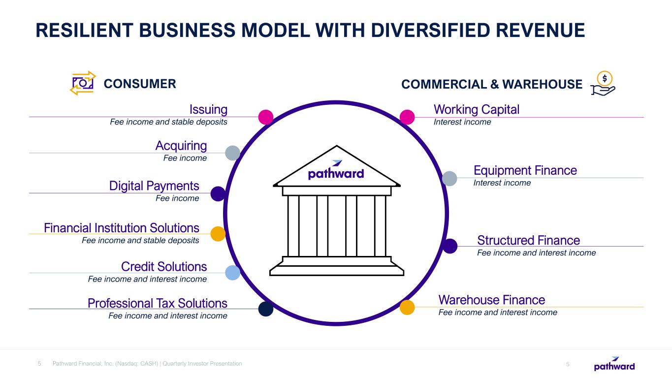 BUILDING A DIVERSIFIED COMPANY DEDICATED TO FINANCIAL EMPOWERMENT FOR INDIVIDUALS AND BUSINESSES 4 1993 Listed on Nasdaq: CASH 2015 / 2016 Entered Tax Services business by acquiring Refund Advantage, SCS, and EPS 2020 Completed sale of Retail Bank division to focus on national banking operations and payments Developed a governance structure that aligns with key sustainability efforts Converted to National Bank Charter 2004 Created Prepaid Card Sponsorship business - now Partner Solutions 2014 Acquired AFS/IBEX, an insurance premium finance company 2018 Acquired Crestmark Bancorp, a commercial lending company Dramatic growth in deposits from Payments business heavily invested in securities, treasuries, and bond portfolio. 1954 Founded as a savings and loan bank 2021 Sold Meta trademarks and began rebranding initiative 2022 Completed rebranding as Pathward Financial 4 Pathward Financial, Inc. (Nasdaq: CASH) | Quarterly Investor Presentation 2024 Completed sale of Insurance Premium Finance business line to focus on higher return on asset verticals Note: Timeline and years presented are on a calendar year basis.