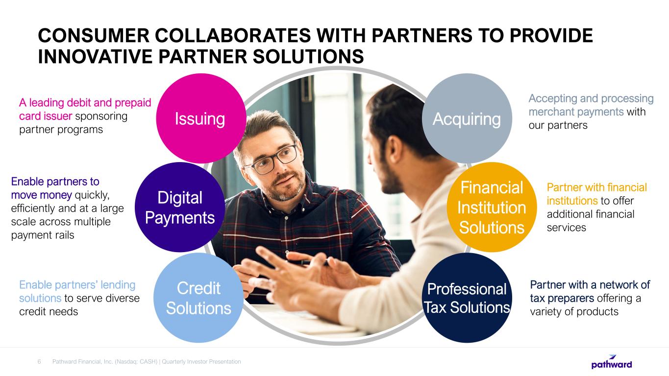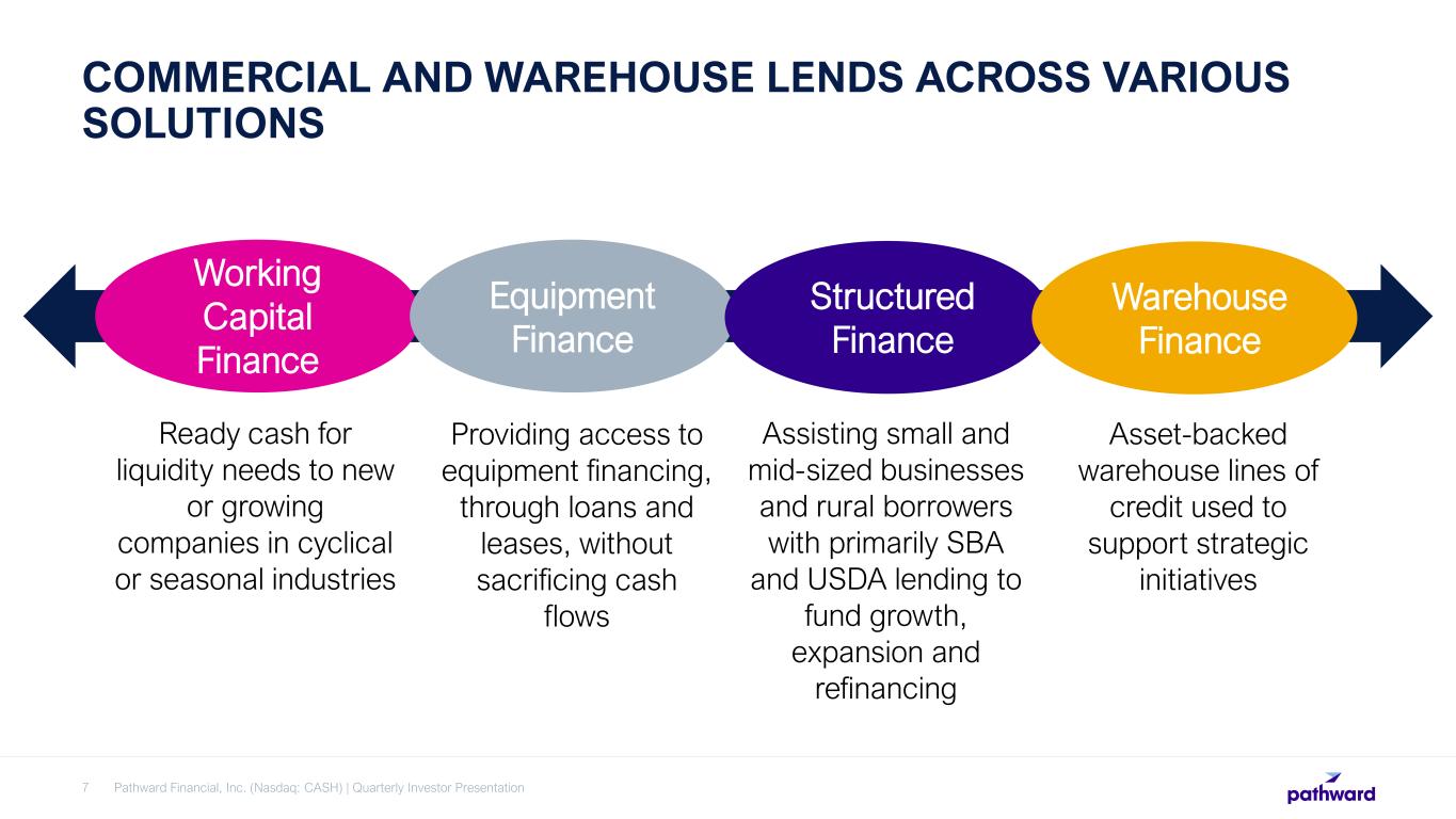 CONSUMER COLLABORATES WITH PARTNERS TO PROVIDE INNOVATIVE PARTNER SOLUTIONS 6 Pathward Financial, Inc. (Nasdaq: CASH) | Quarterly Investor Presentation Issuing Acquiring Digital Payments Financial Institution Solutions Credit Solutions Professional Tax Solutions A leading debit and prepaid card issuer sponsoring partner programs Enable partners’ lending solutions to serve diverse credit needs Partner with a network of tax preparers offering a variety of products Partner with financial institutions to offer additional financial services Enable partners to move money quickly, efficiently and at a large scale across multiple payment rails Accepting and processing merchant payments with our partners