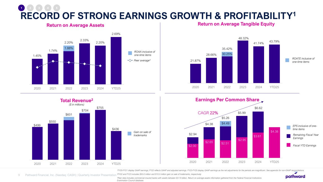 RECORD OF STRONG EARNINGS GROWTH AND PROFITABILITY ABOVE BANKING INDUSTRY AVERAGES EXCESS CAPITAL GENERATING BUSINESS ENABLES ONGOING RETURN OF VALUE TO SHAREHOLDERS INVESTMENT HIGHLIGHTS 2 3 4 1 5 EXPERIENCED LEADER IN FAST-GROWING PAYMENTS SECTOR, WITH DIVERSIFIED PORTFOLIO OF HIGH- QUALITY FINANCIAL PARTNERS RESILIENT COMMERCIAL FINANCE LOAN PORTFOLIO PRODUCES ATTRACTIVE RETURNS THROUGHOUT ECONOMIC CYCLES MATURE RISK MITIGATION AND COMPLIANCE CAPABILITIES WITH HIGHLY ADVANTAGEOUS NATIONAL BANK CHARTER 8 Pathward Financial, Inc. (Nasdaq: CASH) | Quarterly Investor Presentation