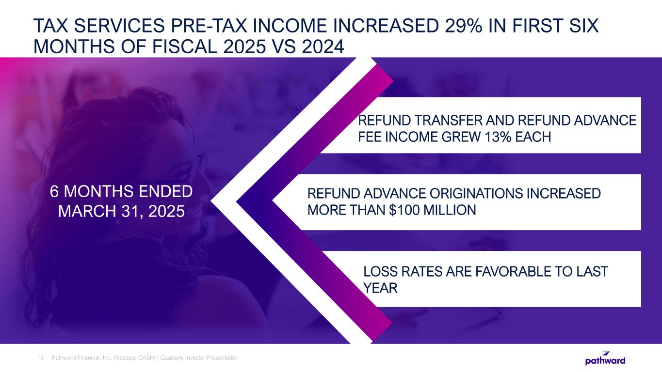 Net Income $74.3 million in net income; an increase of 14% compared to Q2 FY 2024 Diluted Earnings Per Share $3.11 in diluted earnings per share; an increase of 21% compared to Q2 FY 2024 Net Interest Margin Net interest margin (“NIM”) of 6.50% compared to 6.23% in prior year period; Adjusted NIM1, including contractual, rate-related processing expenses associated with deposits on the Company’s balance sheet, of 5.09% compared to 4.76% in prior year period Return Metrics2 FY 2025 six months ended return on average assets (“ROAA”) of 2.69% compared to 2.35% in prior year period; FY 2025 six months ended return on average tangible equity (“ROATE”) of 43.79% compared to 51.09% in prior year period Q2 FY 2025 HIGHLIGHTS Pathward Financial, Inc. (Nasdaq: CASH) | Quarterly Investor Presentation15 1 See slide 43 for reconciliation to most directly comparable GAAP measure. 2 ROAA and ROATE are annualized for periods presented.