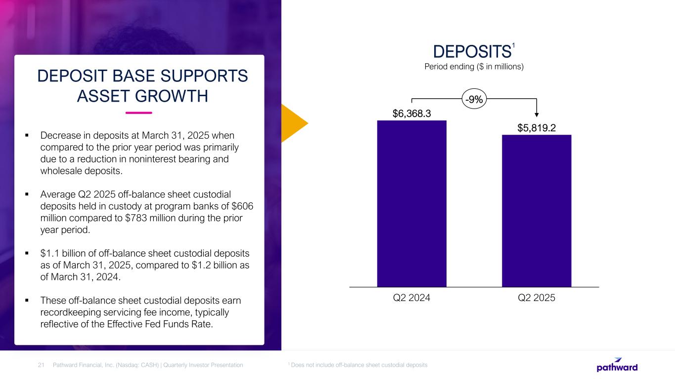 REVENUE GROWTH DELIVERING SOLID RESULTS ($ IN MILLIONS, EXCEPT PER SHARE DATA) Pathward Financial, Inc. (Nasdaq: CASH) | Quarterly Investor Presentation20 Q2 2024 Q2 2025 $118.3 $124.3 +5% Net Interest Income Q2 2024 Q2 2025 $140.4 $142.5 +1% Noninterest Expense Q2 2024 Q2 2025 $128.9 $138.5 +7% Noninterest Income Q2 2024 Q2 2025 $65.3 $74.3 +14% Net Income Attributable to Parent $2.56 $3.11 Q2 2024 Q2 2025 +21% Earnings per Diluted Share