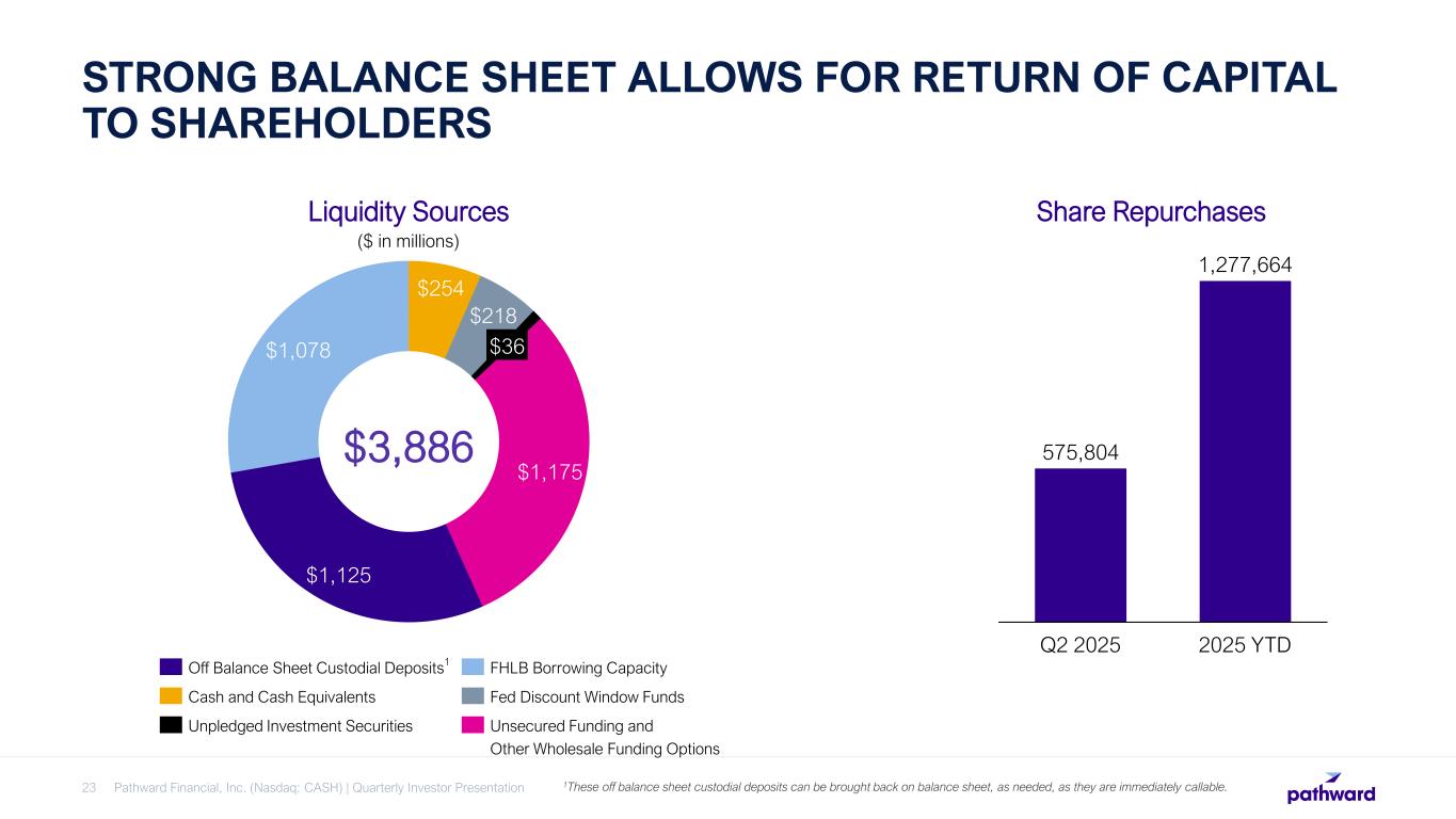 TOTAL LOANS AND LEASES INCREASED FROM Q2 2024  Increase primarily driven by term lending, warehouse finance and asset-based lending.  Growth was partially offset by the sale of insurance premium finance loans during Q1FY25.  Nonperforming loans and leases of 0.88% compared to 0.78% at March 31, 2024.  Annualized adjusted net charge-off rate of 0.61% for 2Q251. Q2 2024 Q2 2025 $4,409.4 $4,464.9 +1% TOTAL LOANS AND LEASES Period ending ($ in millions) Pathward Financial, Inc. (Nasdaq: CASH) | Quarterly Investor Presentation22 1 See slide 42 for reconciliation to most directly comparable GAAP measure.