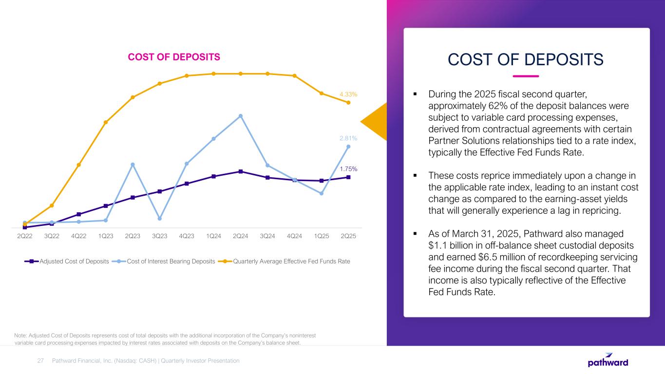  Noninterest income represents 45% of year-to- date total revenue.  Majority of noninterest income fees are generated by the Company’s Partner Solutions business lines. Other major items include leasing rental income and secondary market revenue.  Pathward’s large fee income base provides stability through interest rate and credit cycles, while propelling continued revenue growth.  The majority of Pathward’s tax season revenue is recorded as noninterest income during the second quarter of each fiscal year. DIVERSIFIED NONINTEREST INCOME STREAMS Pathward Financial, Inc. (Nasdaq: CASH) | Quarterly Investor Presentation26 Refund Transfer Product Fees 17% Refund Advance and Other Tax Product Fees 25% Card and Deposit Fees 30% Rental Income 14% Secondary Market Revenue 10% Other Income 4% FYTD 2025 NONINTEREST INCOME BREAKDOWN . Noninterest income 45% Net interest income 55% FYTD 2025 REVENUE BREAKDOWN