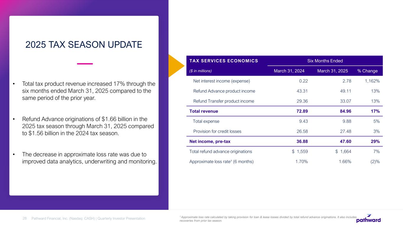 • Total tax product revenue increased 17% through the six months ended March 31, 2025 compared to the same period of the prior year. • Refund Advance originations of $1.66 billion in the 2025 tax season through March 31, 2025 compared to $1.56 billion in the 2024 tax season. • The decrease in approximate loss rate was due to improved data analytics, underwriting and monitoring. 2025 TAX SEASON UPDATE Pathward Financial, Inc. (Nasdaq: CASH) | Quarterly Investor Presentation28 1 Approximate loss rate calculated by taking provision for loan & lease losses divided by total refund advance originations. It also includes recoveries from prior tax season. TAX SERVICES ECONOMICS Six Months Ended ($ in millions) March 31, 2024 March 31, 2025 % Change Net interest income (expense) 0.22 2.78 1,162% Refund Advance product income 43.31 49.11 13% Refund Transfer product income 29.36 33.07 13% Total revenue 72.89 84.96 17% Total expense 9.43 9.88 5% Provision for credit losses 26.58 27.48 3% Net income, pre-tax 36.88 47.60 29% Total refund advance originations $ 1,559 $ 1,664 7% Approximate loss rate¹ (6 months) 1.70% 1.66% (2)%