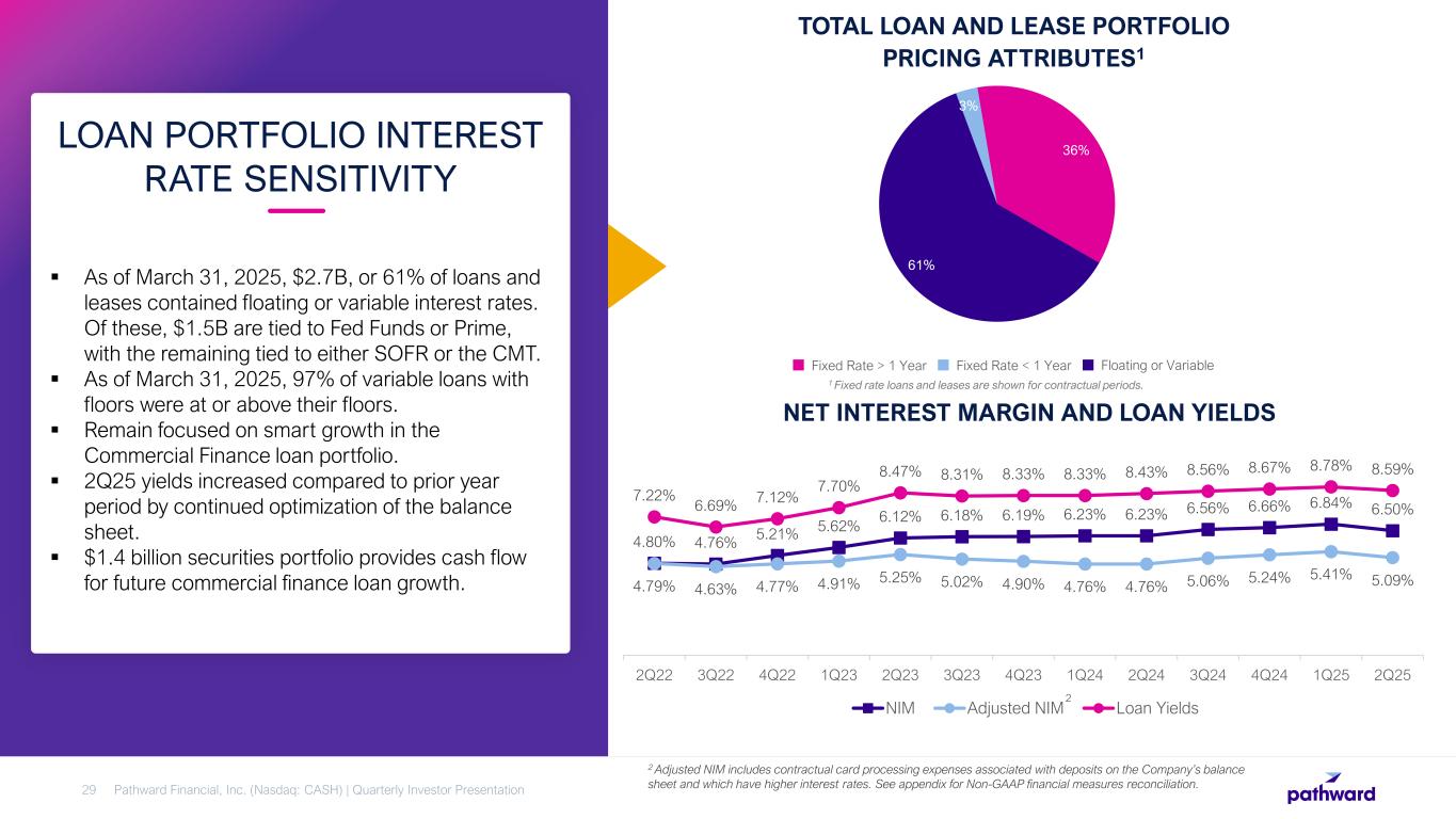  During the 2025 fiscal second quarter, approximately 62% of the deposit balances were subject to variable card processing expenses, derived from contractual agreements with certain Partner Solutions relationships tied to a rate index, typically the Effective Fed Funds Rate.  These costs reprice immediately upon a change in the applicable rate index, leading to an instant cost change as compared to the earning-asset yields that will generally experience a lag in repricing.  As of March 31, 2025, Pathward also managed $1.1 billion in off-balance sheet custodial deposits and earned $6.5 million of recordkeeping servicing fee income during the fiscal second quarter. That income is also typically reflective of the Effective Fed Funds Rate. COST OF DEPOSITS Pathward Financial, Inc. (Nasdaq: CASH) | Quarterly Investor Presentation27 COST OF DEPOSITS 1.75% 2.81% 4.33% 2Q22 3Q22 4Q22 1Q23 2Q23 3Q23 4Q23 1Q24 2Q24 3Q24 4Q24 1Q25 2Q25 Adjusted Cost of Deposits Cost of Interest Bearing Deposits Quarterly Average Effective Fed Funds Rate Note: Adjusted Cost of Deposits represents cost of total deposits with the additional incorporation of the Company’s noninterest variable card processing expenses impacted by interest rates associated with deposits on the Company’s balance sheet.