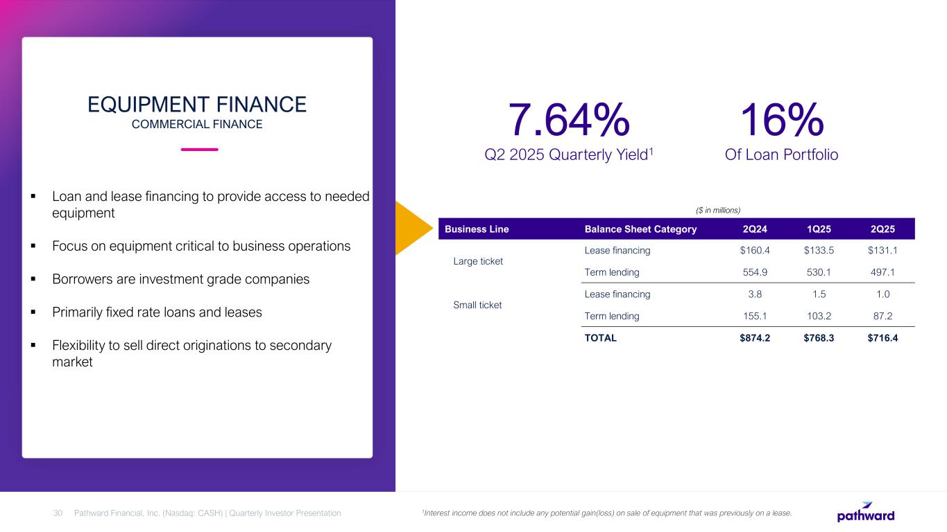  As of March 31, 2025, $2.7B, or 61% of loans and leases contained floating or variable interest rates. Of these, $1.5B are tied to Fed Funds or Prime, with the remaining tied to either SOFR or the CMT.  As of March 31, 2025, 97% of variable loans with floors were at or above their floors.  Remain focused on smart growth in the Commercial Finance loan portfolio.  2Q25 yields increased compared to prior year period by continued optimization of the balance sheet.  $1.4 billion securities portfolio provides cash flow for future commercial finance loan growth. LOAN PORTFOLIO INTEREST RATE SENSITIVITY Pathward Financial, Inc. (Nasdaq: CASH) | Quarterly Investor Presentation29 1 Fixed rate loans and leases are shown for contractual periods. 61% 3% 36% Fixed Rate > 1 Year TOTAL LOAN AND LEASE PORTFOLIO PRICING ATTRIBUTES1 Fixed Rate < 1 Year Floating or Variable NET INTEREST MARGIN AND LOAN YIELDS 4.80% 4.76% 5.21% 5.62% 6.12% 6.18% 6.19% 6.23% 6.23% 6.56% 6.66% 6.84% 6.50% 4.79% 4.63% 4.77% 4.91% 5.25% 5.02% 4.90% 4.76% 4.76% 5.06% 5.24% 5.41% 5.09% 7.22% 6.69% 7.12% 7.70% 8.47% 8.31% 8.33% 8.33% 8.43% 8.56% 8.67% 8.78% 8.59% 2Q22 3Q22 4Q22 1Q23 2Q23 3Q23 4Q23 1Q24 2Q24 3Q24 4Q24 1Q25 2Q25 NIM Adjusted NIM Loan Yields 2 Adjusted NIM includes contractual card processing expenses associated with deposits on the Company’s balance sheet and which have higher interest rates. See appendix for Non-GAAP financial measures reconciliation. 2