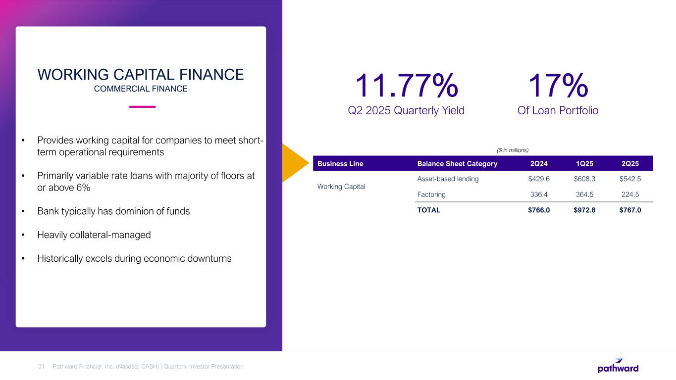  Loan and lease financing to provide access to needed equipment  Focus on equipment critical to business operations  Borrowers are investment grade companies  Primarily fixed rate loans and leases  Flexibility to sell direct originations to secondary market EQUIPMENT FINANCE COMMERCIAL FINANCE Pathward Financial, Inc. (Nasdaq: CASH) | Quarterly Investor Presentation30 7.64% Q2 2025 Quarterly Yield1 16% Of Loan Portfolio Business Line Balance Sheet Category 2Q24 1Q25 2Q25 Large ticket Lease financing $160.4 $133.5 $131.1 Term lending 554.9 530.1 497.1 Small ticket Lease financing 3.8 1.5 1.0 Term lending 155.1 103.2 87.2 TOTAL $874.2 $768.3 $716.4 ($ in millions) 1Interest income does not include any potential gain(loss) on sale of equipment that was previously on a lease.