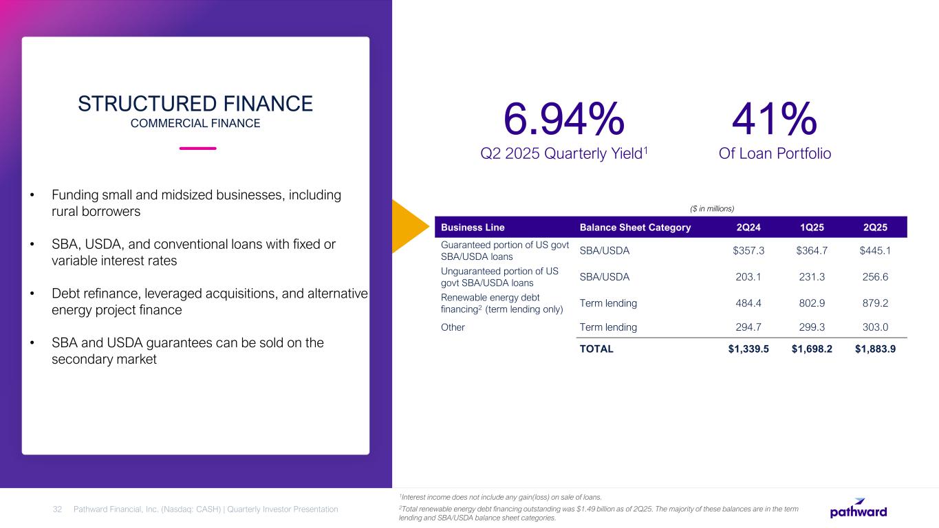 • Provides working capital for companies to meet short- term operational requirements • Primarily variable rate loans with majority of floors at or above 6% • Bank typically has dominion of funds • Heavily collateral-managed • Historically excels during economic downturns WORKING CAPITAL FINANCE COMMERCIAL FINANCE Pathward Financial, Inc. (Nasdaq: CASH) | Quarterly Investor Presentation31 11.77% Q2 2025 Quarterly Yield 17% Of Loan Portfolio Business Line Balance Sheet Category 2Q24 1Q25 2Q25 Working Capital Asset-based lending $429.6 $608.3 $542.5 Factoring 336.4 364.5 224.5 TOTAL $766.0 $972.8 $767.0 ($ in millions)
