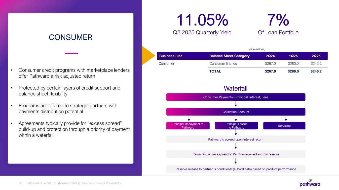 • Funding small and midsized businesses, including rural borrowers • SBA, USDA, and conventional loans with fixed or variable interest rates • Debt refinance, leveraged acquisitions, and alternative energy project finance • SBA and USDA guarantees can be sold on the secondary market STRUCTURED FINANCE COMMERCIAL FINANCE Pathward Financial, Inc. (Nasdaq: CASH) | Quarterly Investor Presentation32 6.94% Q2 2025 Quarterly Yield1 41% Of Loan Portfolio ($ in millions) Business Line Balance Sheet Category 2Q24 1Q25 2Q25 Guaranteed portion of US govt SBA/USDA loans SBA/USDA $357.3 $364.7 $445.1 Unguaranteed portion of US govt SBA/USDA loans SBA/USDA 203.1 231.3 256.6 Renewable energy debt financing2 (term lending only) Term lending 484.4 802.9 879.2 Other Term lending 294.7 299.3 303.0 TOTAL $1,339.5 $1,698.2 $1,883.9 2Total renewable energy debt financing outstanding was $1.49 billion as of 2Q25. The majority of these balances are in the term lending and SBA/USDA balance sheet categories. 1Interest income does not include any gain(loss) on sale of loans.