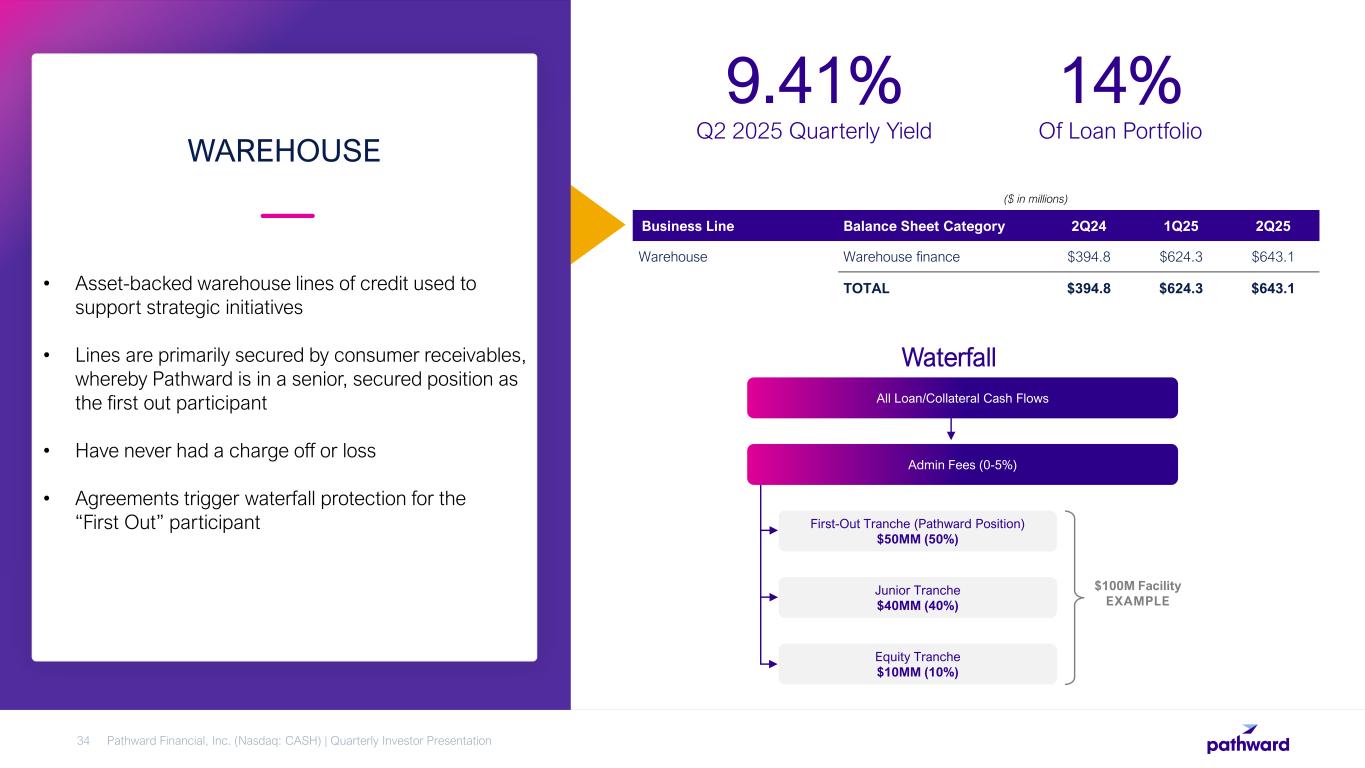 • Consumer credit programs with marketplace lenders offer Pathward a risk adjusted return • Protected by certain layers of credit support and balance sheet flexibility • Programs are offered to strategic partners with payments distribution potential • Agreements typically provide for “excess spread” build-up and protection through a priority of payment within a waterfall CONSUMER Pathward Financial, Inc. (Nasdaq: CASH) | Quarterly Investor Presentation33 11.05% Q2 2025 Quarterly Yield 7% Of Loan Portfolio ($ in millions) Business Line Balance Sheet Category 2Q24 1Q25 2Q25 Consumer Consumer finance $267.0 $280.0 $246.2 TOTAL $267.0 $280.0 $246.2 Consumer Payments - Principal, Interest, Fees Collection Account Servicing Principal Losses to Pathward Principal Repayment to Pathward Pathward’s agreed upon interest return Remaining excess spread to Pathward-owned escrow reserve Reserve release to partner is conditional (subordinate) based on product performance Waterfall