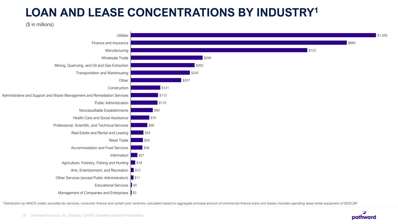 Pathward Financial, Inc. (Nasdaq: CASH) | Quarterly Investor Presentation35 LOAN AND LEASE CONCENTRATIONS BY INDUSTRY1 1 Distribution by NAICS codes; excludes tax services, consumer finance and certain joint ventures; calculated based on aggregate principal amount of commercial finance loans and leases; includes operating lease rental equipment of $202.2M $1,005 $885 $723 $294 $262 $242 $207 $121 $112 $110 $90 $76 $68 $52 $50 $48 $27 $18 $12 $11 $5 $3 Utilities Finance and Insurance Manufacturing Wholesale Trade Mining, Quarrying, and Oil and Gas Extraction Transportation and Warehousing Other Construction Administrative and Support and Waste Management and Remediation Services Public Administration Nonclassifiable Establishments Health Care and Social Assistance Professional, Scientific, and Technical Services Real Estate and Rental and Leasing Retail Trade Accommodation and Food Services Information Agriculture, Forestry, Fishing and Hunting Arts, Entertainment, and Recreation Other Services (except Public Administration) Educational Services Management of Companies and Enterprises ($ in millions)