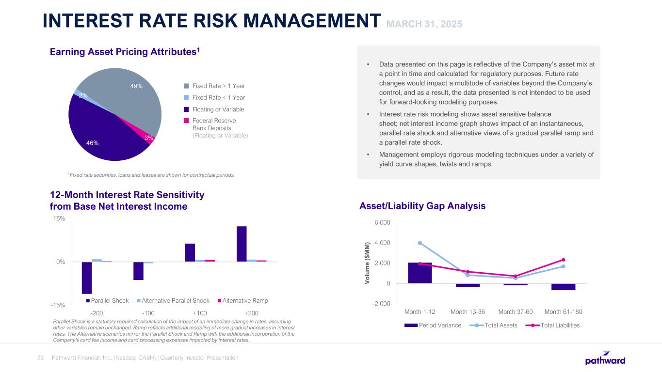 Pathward Financial, Inc. (Nasdaq: CASH) | Quarterly Investor Presentation36 INTEREST RATE RISK MANAGEMENT MARCH 31, 2025 Asset/Liability Gap Analysis 1 Fixed rate securities, loans and leases are shown for contractual periods. 3% 46% 2% 49% Fixed Rate > 1 Year Earning Asset Pricing Attributes1 Fixed Rate < 1 Year Floating or Variable Federal Reserve Bank Deposits (Floating or Variable) • Data presented on this page is reflective of the Company’s asset mix at a point in time and calculated for regulatory purposes. Future rate changes would impact a multitude of variables beyond the Company’s control, and as a result, the data presented is not intended to be used for forward-looking modeling purposes. • Interest rate risk modeling shows asset sensitive balance sheet; net interest income graph shows impact of an instantaneous, parallel rate shock and alternative views of a gradual parallel ramp and a parallel rate shock. • Management employs rigorous modeling techniques under a variety of yield curve shapes, twists and ramps. -15% 0% 15% -200 -100 +100 +200 Parallel Shock Alternative Parallel Shock Alternative Ramp 12-Month Interest Rate Sensitivity from Base Net Interest Income Parallel Shock is a statutory required calculation of the impact of an immediate change in rates, assuming other variables remain unchanged. Ramp reflects additional modeling of more gradual increases in interest rates. The Alternative scenarios mirror the Parallel Shock and Ramp with the additional incorporation of the Company’s card fee income and card processing expenses impacted by interest rates. -2,000 0 2,000 4,000 6,000 Month 1-12 Month 13-36 Month 37-60 Month 61-180 V o lu m e ($ M M ) Period Variance Total Assets Total Liabilities