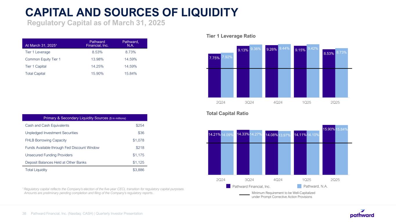 Pathward Financial, Inc. (Nasdaq: CASH) | Quarterly Investor Presentation37 ASSET QUALITY $4.7 $7.0 $7.3 $8.1 $6.9 0.43% 0.63% 0.62% 0.70% 0.61% 0.45% 0.49% 0.52% 0.60% 0.64% 2Q24 3Q24 4Q24 1Q25 2Q25 Period Ended Adj. NCOs Adj. NCOs / Adj. Average Loans Adj. NCOs / Adj. Average Loans - LTM Adjusted Net Charge-Offs (“NCOs”)1 Excludes Tax Services NCOs and Related Seasonal Average Loans ($ in millions) KEY CREDIT METRICS • Annualized adjusted net charge-offs1: – 0.61% of average loans in 2Q25 – 0.64% of average loans over last 12 months • Allowance for credit loss (“ACL”) of $78.4 million as of March 31, 2025. • ACL as a % of total loans and leases was 1.75% for 2Q25, an 8 bps decrease from the prior year. • The increase in NPAs / NPLs compared to the sequential quarter was driven by an increase in nonperforming loans in the commercial finance portfolio, partially offset by a decrease in the consumer finance portfolio. 1 See appendix for Non-GAAP financial measures reconciliation. Tax services NCOs and related seasonal average loans are excluded to adjust for the cyclicality of activity related to the overall economics of the tax services business line. $34.4 $44.6 $41.6 $35.2 $39.8 0.78% 0.96% 0.87% 0.76% 0.88% 2Q24 3Q24 4Q24 1Q25 2Q25 Period Ended NPLs NPLs / Total Loans Nonperforming Assets (“NPAs”) ($ in millions) Nonperforming Loans (“NPLs”) ($ in millions) $37.2 $46.3 $43.0 $37.5 $41.6 0.50% 0.61% 0.57% 0.49% 0.59% 2Q24 3Q24 4Q24 1Q25 2Q25 Period Ended NPAs NPAs / Total Assets