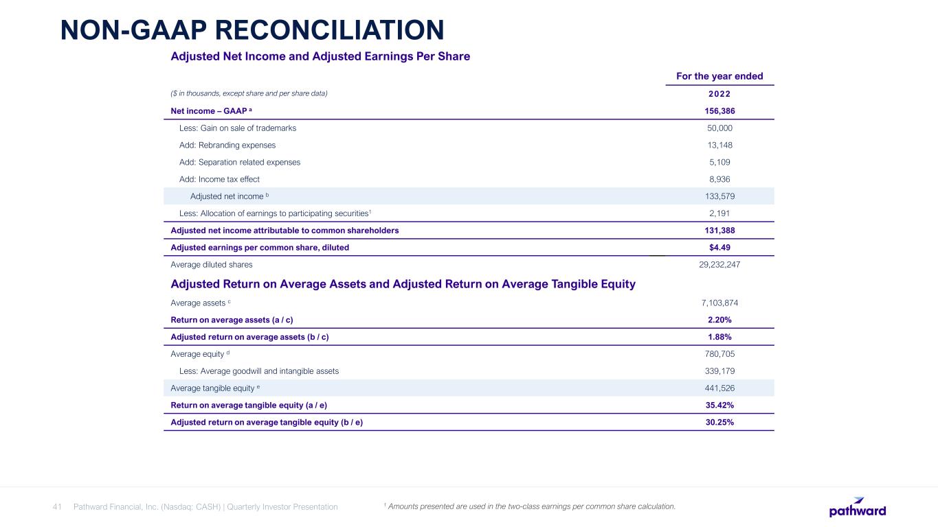 Pathward Financial, Inc. (Nasdaq: CASH) | Quarterly Investor Presentation41 NON-GAAP RECONCILIATION 1 Amounts presented are used in the two-class earnings per common share calculation. Adjusted Net Income and Adjusted Earnings Per Share For the year ended ($ in thousands, except share and per share data) 2022 Net income – GAAP a 156,386 Less: Gain on sale of trademarks 50,000 Add: Rebranding expenses 13,148 Add: Separation related expenses 5,109 Add: Income tax effect 8,936 Adjusted net income b 133,579 Less: Allocation of earnings to participating securities1 2,191 Adjusted net income attributable to common shareholders 131,388 Adjusted earnings per common share, diluted $4.49 Average diluted shares 29,232,247 Adjusted Return on Average Assets and Adjusted Return on Average Tangible Equity Average assets c 7,103,874 Return on average assets (a / c) 2.20% Adjusted return on average assets (b / c) 1.88% Average equity d 780,705 Less: Average goodwill and intangible assets 339,179 Average tangible equity e 441,526 Return on average tangible equity (a / e) 35.42% Adjusted return on average tangible equity (b / e) 30.25%