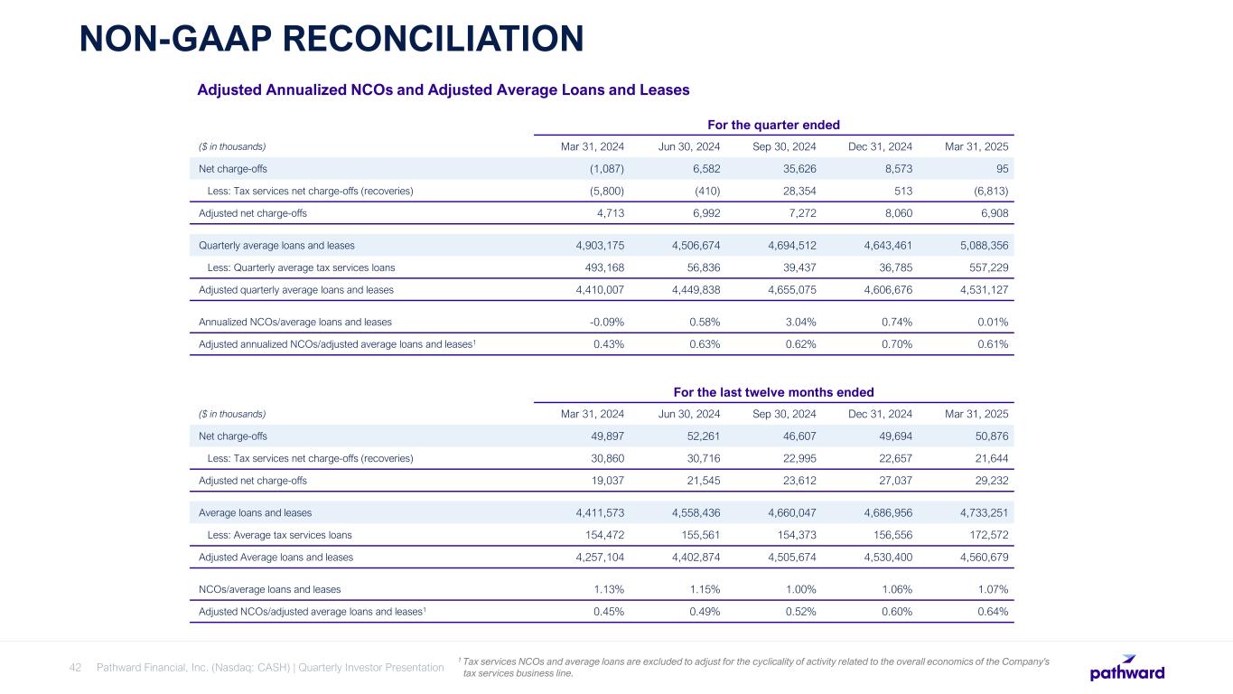 Pathward Financial, Inc. (Nasdaq: CASH) | Quarterly Investor Presentation42 NON-GAAP RECONCILIATION 1 Tax services NCOs and average loans are excluded to adjust for the cyclicality of activity related to the overall economics of the Company's tax services business line. For the quarter ended ($ in thousands) Mar 31, 2024 Jun 30, 2024 Sep 30, 2024 Dec 31, 2024 Mar 31, 2025 Net charge-offs (1,087) 6,582 35,626 8,573 95 Less: Tax services net charge-offs (recoveries) (5,800) (410) 28,354 513 (6,813) Adjusted net charge-offs 4,713 6,992 7,272 8,060 6,908 Quarterly average loans and leases 4,903,175 4,506,674 4,694,512 4,643,461 5,088,356 Less: Quarterly average tax services loans 493,168 56,836 39,437 36,785 557,229 Adjusted quarterly average loans and leases 4,410,007 4,449,838 4,655,075 4,606,676 4,531,127 Annualized NCOs/average loans and leases -0.09% 0.58% 3.04% 0.74% 0.01% Adjusted annualized NCOs/adjusted average loans and leases1 0.43% 0.63% 0.62% 0.70% 0.61% Adjusted Annualized NCOs and Adjusted Average Loans and Leases For the last twelve months ended ($ in thousands) Mar 31, 2024 Jun 30, 2024 Sep 30, 2024 Dec 31, 2024 Mar 31, 2025 Net charge-offs 49,897 52,261 46,607 49,694 50,876 Less: Tax services net charge-offs (recoveries) 30,860 30,716 22,995 22,657 21,644 Adjusted net charge-offs 19,037 21,545 23,612 27,037 29,232 Average loans and leases 4,411,573 4,558,436 4,660,047 4,686,956 4,733,251 Less: Average tax services loans 154,472 155,561 154,373 156,556 172,572 Adjusted Average loans and leases 4,257,104 4,402,874 4,505,674 4,530,400 4,560,679 NCOs/average loans and leases 1.13% 1.15% 1.00% 1.06% 1.07% Adjusted NCOs/adjusted average loans and leases1 0.45% 0.49% 0.52% 0.60% 0.64%